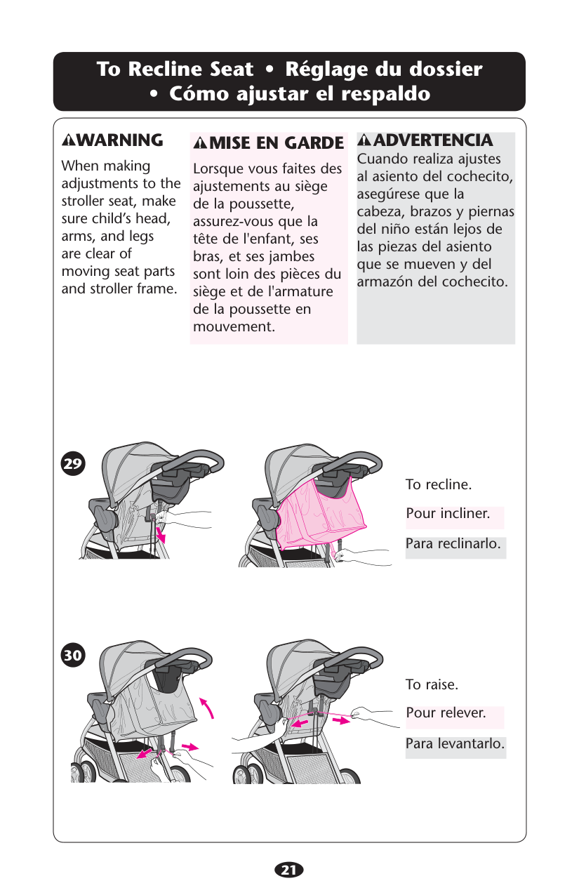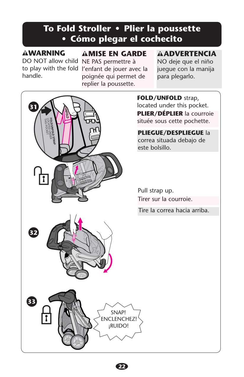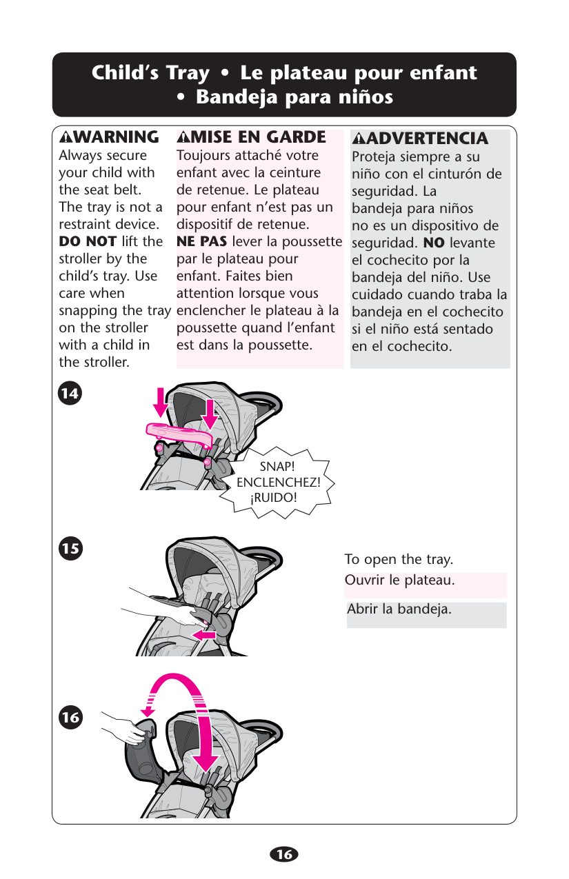 Proteja siempre a su niño con el cinturón de seguridad. La bandeja para niños no es un dispositivo de seguridad. NO levante el cochecito por la bandeja del niño. Use cuidado cuando traba la bandeja en el cochecito si el niño está sentado en el cochecito. 14 15 16 To open the tray. Ouvrir le plateau. Abrir la bandeja.Snap!