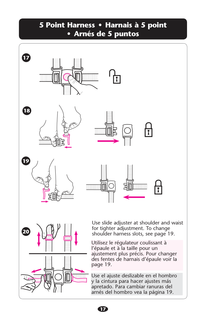 17 0OINT(ARNESS s (ARNAISÌPOINT s !RNÏSDEPUNTOS 18 Use slide adjuster at shoulder and waist for tighter adjustment. To change shoulder harness slots, see page 19. Utilisez le régulateur coulissant à l’épaule et à la taille pour un ajustement plus précis. Pour changer des fentes de harnais d’épaule voir la page 19. Use el ajuste deslizable en el hombro y la cintura para hacer ajustes más apretado. Para cambiar ranuras del arnés del hombro vea la página 19. 20 17 19