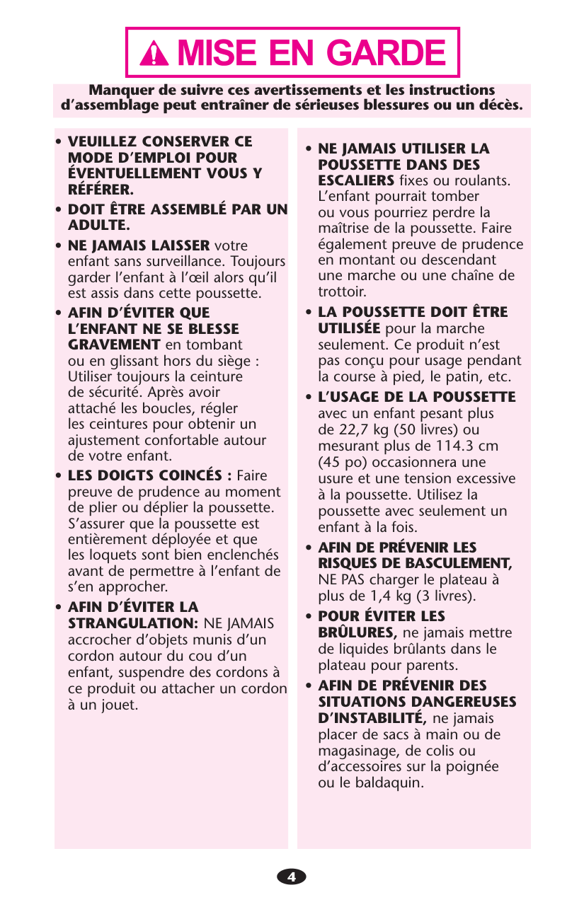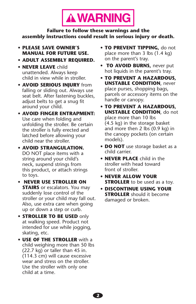 sADULT ASSEMBLY REQUIRED. sNEVER LEAVE child unattended. Always keep child in view while in stroller. sAVOID SERIOUS INJURY from falling or sliding out. Always use seat belt. After fastening buckles, adjust belts to get a snug fit around your child. sAVOID FINGER ENTRAPMENT: Use care when folding and unfolding the stroller. Be certain the stroller is fully erected and latched before allowing your child near the stroller. sAVOID STRANGULATION. DO NOT place items with a string around your child’s neck, suspend strings from this product, or attach strings to toys. s NEVER USE STROLLER ON STAIRS or escalators. You may suddenly lose control of the stroller or your child may fall out. Also, use extra care when going up or down a step or curb. sSTROLLER TO BE USED only at walking speed. Product not intended for use while jogging, skating, etc. sUSE OF THE STROLLER with a child weighing more than 50 lbs (22.7 kg) or taller than 45 in. (114.3 cm) will cause excessive wear and stress on the stroller. Use the stroller with only one child at a time. sTO PREVENT TIPPING, do not place more than 3 lbs (1.4 kg) on the parent’s tray. s TO AVOID BURNS, never put hot liquids in the parent’s tray. sTO PREVENT A HAZARDOUS, UNSTABLE CONDITION, never place purses, shopping bags, parcels or accessory items on the handle or canopy. sTO PREVENT A HAZARDOUS, UNSTABLE CONDITION, do not place more than 10 lbs (4.5 kg) in the storage basket and more then 2 lbs (0.9 kg) in the canopy pockets (on certain models). sDO NOT use storage basket as a child carrier. sNEVER PLACE child in the stroller with head toward front of stroller. sNEVER ALLOW YOUR STROLLER to be used as a toy. sDISCONTINUE USING YOUR STROLLER should it become damaged or broken.3