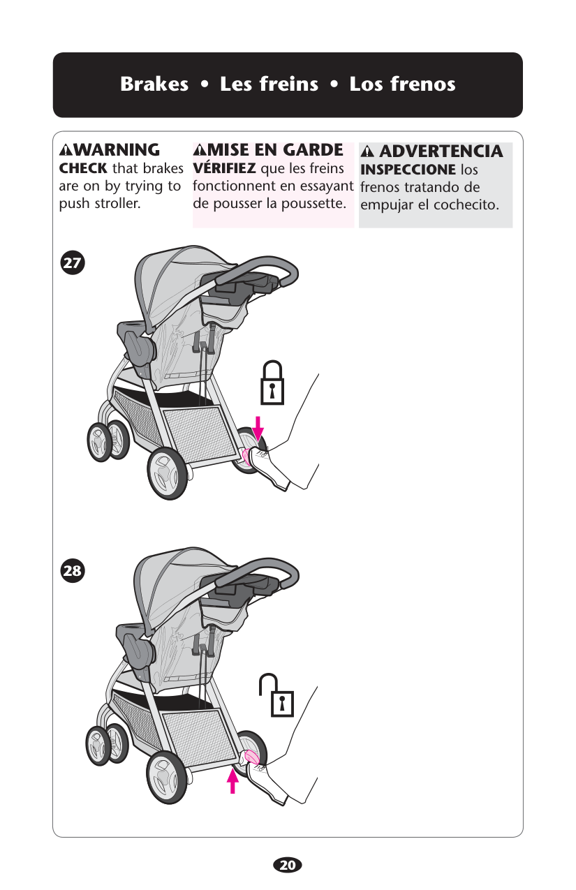 VÉRIFIEZ que les freins fonctionnent en essayant de pousser la poussette.Advertencia
