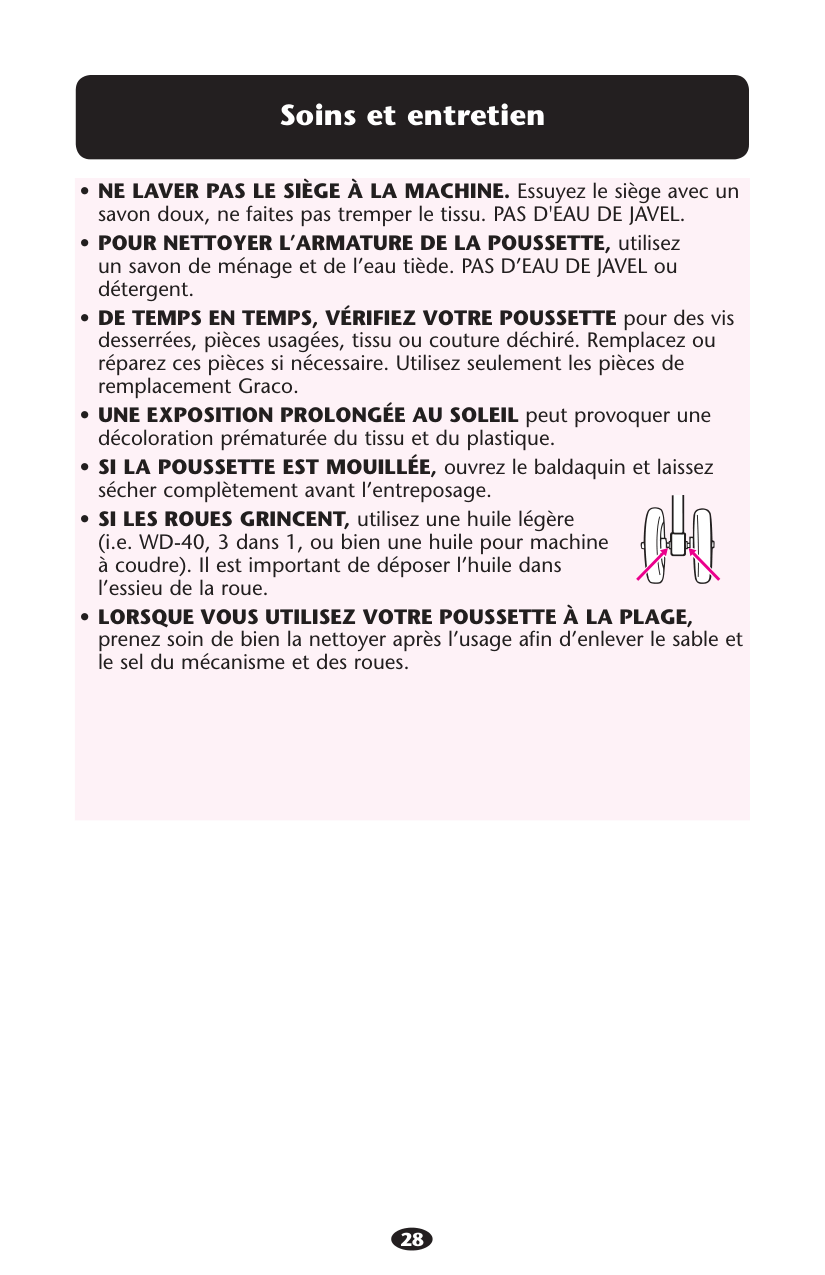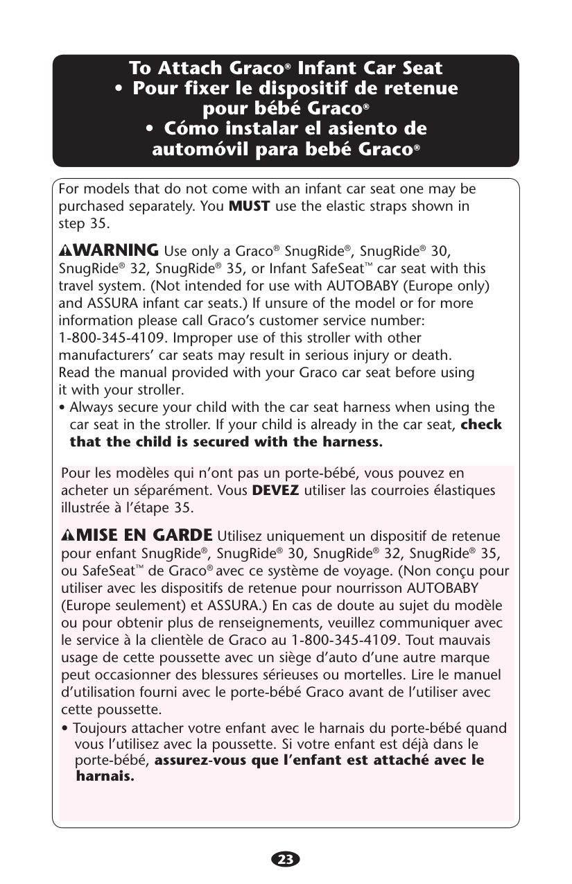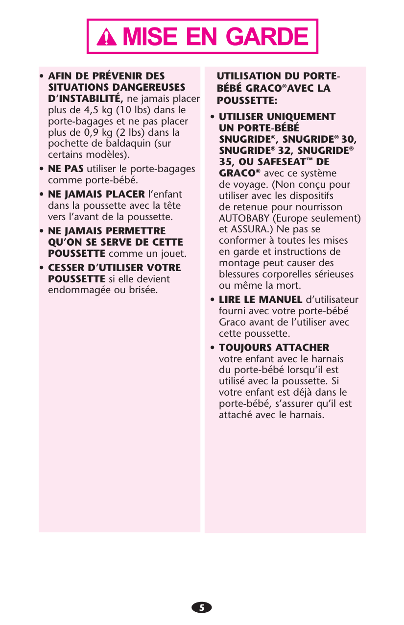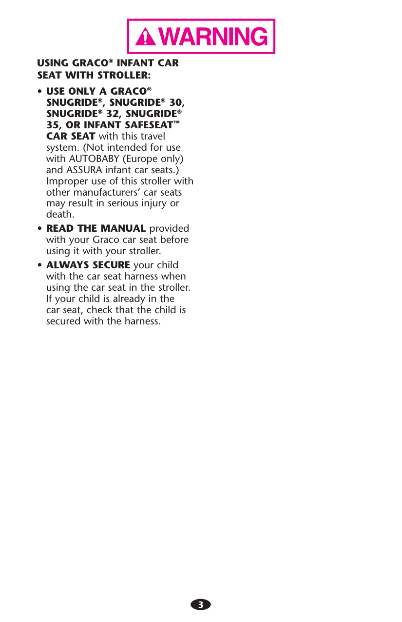 CAR SEAT with this travel system. (Not intended for use with AUTOBABY (Europe only) and ASSURA infant car seats.) Improper use of this stroller with other manufacturers’ car seats may result in serious injury or death. sREAD THE MANUAL provided with your Graco car seat before using it with your stroller. sALWAYS SECURE your child with the car seat harness when using the car seat in the stroller. If your child is already in the car seat, check that the child is secured with the harness.4 Manquer de suivre ces avertissements et les instructions d’assemblage peut entraîner de sérieuses blessures ou un décès. sVEUILLEZ CONSERVER CE