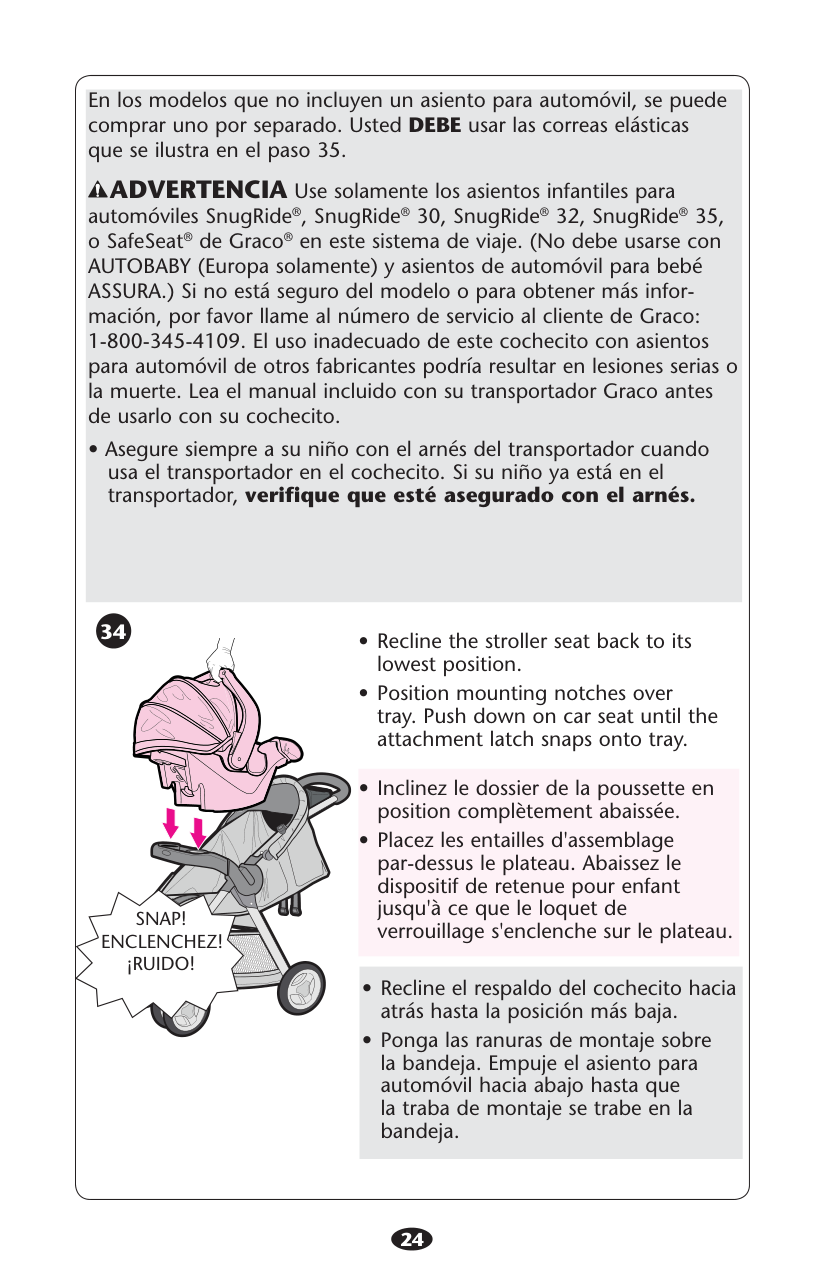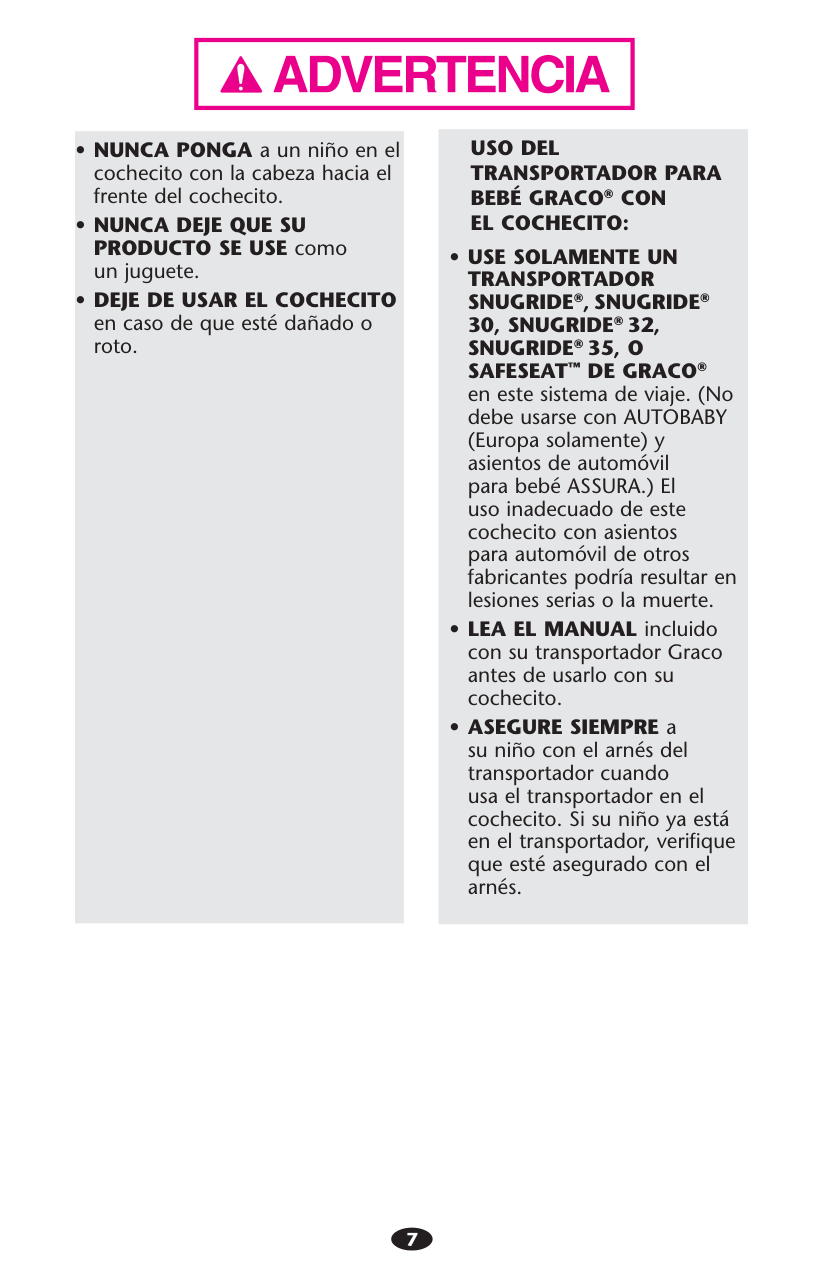 GRACO® avec ce système de voyage. (Non conçu pour utiliser avec les dispositifs de retenue pour nourrisson AUTOBABY (Europe seulement) et ASSURA.) Ne pas se conformer à toutes les mises en garde et instructions de montage peut causer des blessures corporelles sérieuses ou même la mort. sLIRE LE MANUEL d’utilisateur fourni avec votre porte-bébé Graco avant de l’utiliser avec cette poussette. sTOUJOURS ATTACHER votre enfant avec le harnais du porte-bébé lorsqu’il est utilisé avec la poussette. Si votre enfant est déjà dans le porte-bébé, s’assurer qu’il est attaché avec le harnais.6 No observar estas advertencias y las instrucciones de armado podría resultar en lesiones serias o la muerte. sPOR FAVOR, GUARDE EL