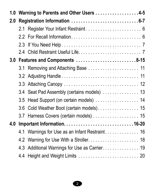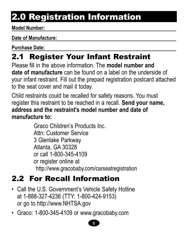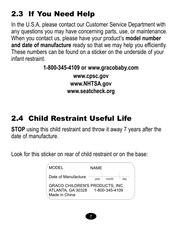 77 2.3 Si necesita ayuda En los EE.UU., por favor, comuníquese con nuestro Departamento de Servicio al Cliente con cualquier pregunta que pudiera tener sobre piezas, uso o mantenimiento. Cuando se ponga en contacto con nosotros, por favor tenga listo el número de modelo y la fecha de fabricación para que lo podamos ayudar más eficientemente. Estos números pueden encontrarse en una etiqueta ubicada en la parte inferior de su sistema de seguridad para bebés. 2.2 Información sobre el retiro de productos del mercado