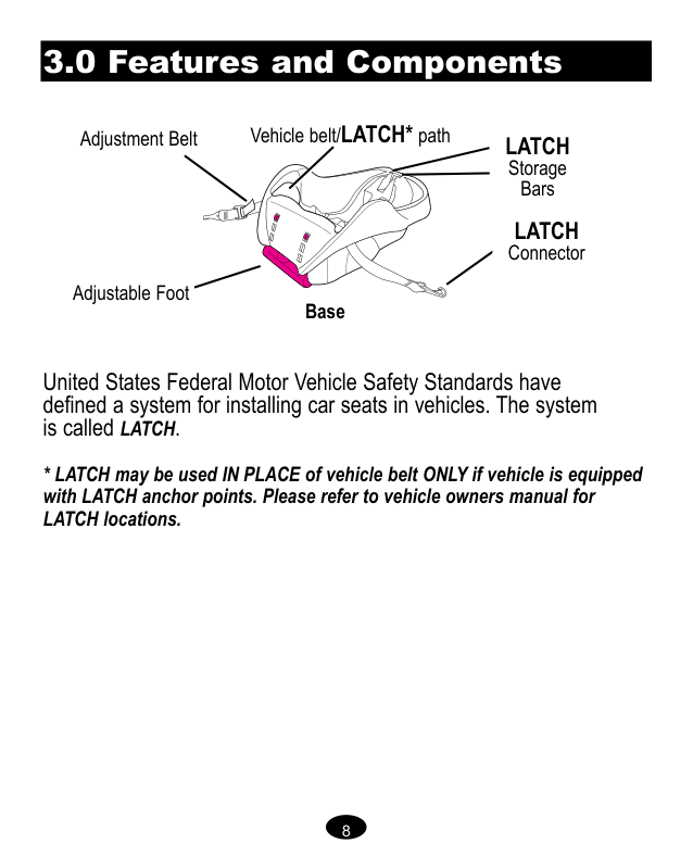 year month day 1-800-345-4109 o www.gracobaby.com www.cpsc.gov www.NHTSA.gov www.seatcheck.org8 3.0 Funciones y componentes Cinturón del vehículo/recorrido del LATCH* Las Normas Federales para Seguridad de Automóviles de Estados Unidos han determinado un sistema de instalación de asientos de seguridad en los vehículos. El sistema se denomina LATCH.