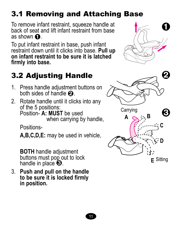 Capota Ranura para el arnés Manija de liberación Traba de conexión Indicador del nivel* Bolsillo del manual del propietario Tensionador del arnés Traba de seguridad** El indicador de nivel se conecta al costado del sistema de seguridad para niños e indica si el sistema de seguridad para niños está debidamente inclinado. La traba de seguridad se guarda en el fondo del sistema de seguridad para niños. Necesitará usarlo con ciertos tipos de cinturones de seguridad de automóviles. **Traba de seguridad *Indicador del nivel 10 10 10 10 10 10 103.1 Sacar y conectar la base Para sacar el sistema de seguridad para niños, apriete la manija de liberación en la parte trasera del asiento y levante el sistema de seguridad para niños de la base como se indica . Para poner el sistema de seguridad para niños en la base, empuje el sistema de seguridad para niños hacia abajo hasta que se trabe en la base. Tire hacia arriba del sistema de seguridad para niños para asegurarse que esté trabado firmemente en la base. 3.2 Ajuste de la manija