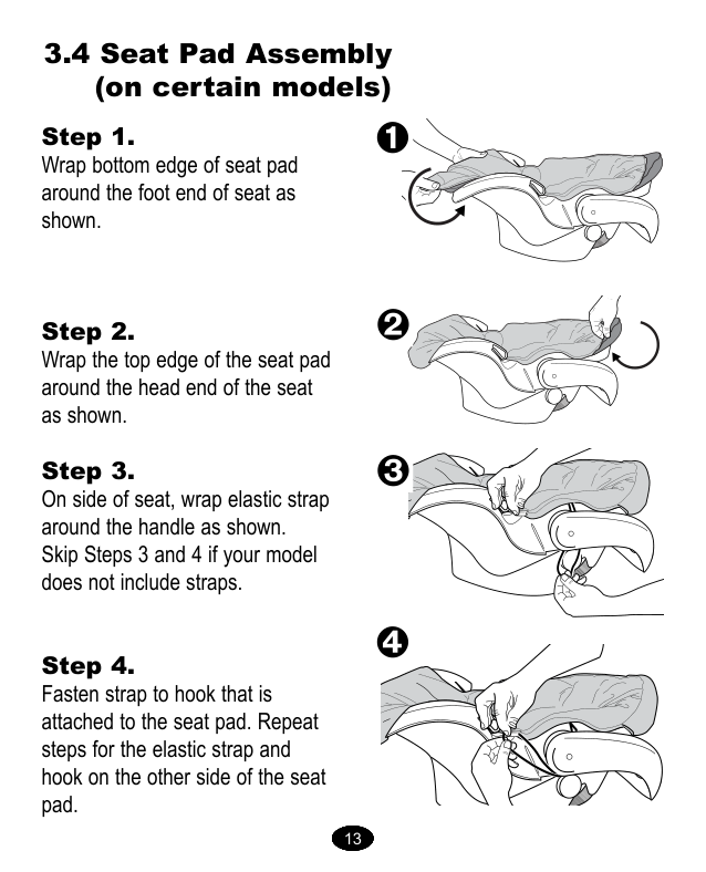 12 12 12 12 12 12 1213 13 13 13 13 13 13 3.4 Armado de la almohadilla del asiento (ciertos modelos) Paso 1. Envuelva el borde inferior de la almohadilla del asiento alrededor del extremo del asiento donde van los pies como se indica. Paso 2. Envuelva el borde superior de la almohadilla del asiento alrededor del extremo del asiento donde va la cabeza como se indica. Paso 3. En el costado del asiento, envuelva la correa elástica alrededor de la manija como se indica. Ignore los pasos 3 y 4 si su modelo no tiene correas elásticas.
