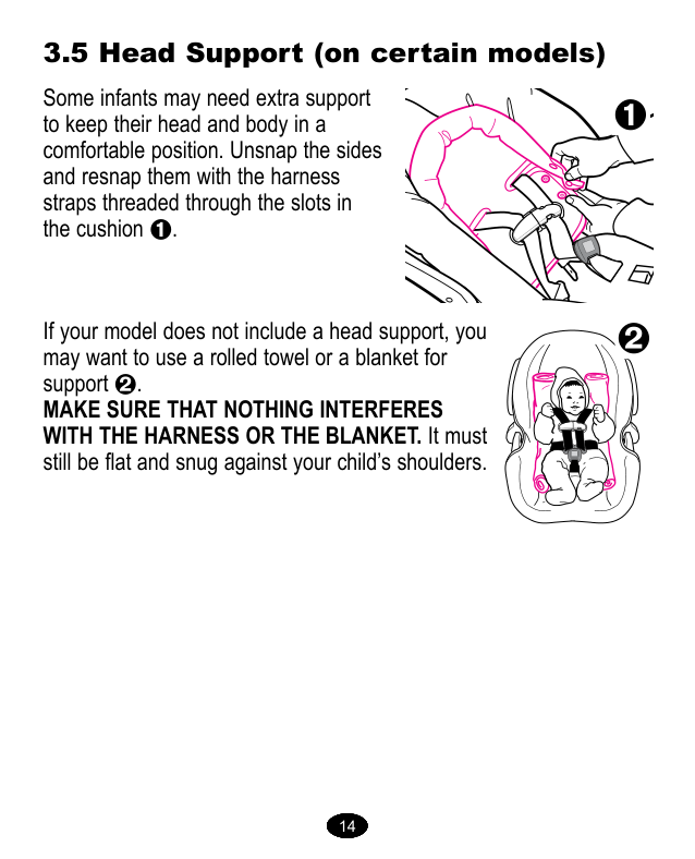 ARNÉS O LA MANTA. El arnés debe quedar plano y ajustarse sobre los hombros del niño. 3.5 Apoyacabezas (en ciertos modelos) 14 14 14 14 14 14 143.6 Bota para tiempo frío (en ciertos modelos) Algunos modelos vienen con una bota para tiempo frío. Para usarla, ponga elástico alrededor del fondo del asiento y coloque elástico alrededor de los ganchos del cinturón del vehículo como se indica . 3.7 Cubiertas de arnes (ciertos modelos) Para prevenir la eyección en un accidente o parada repentina: