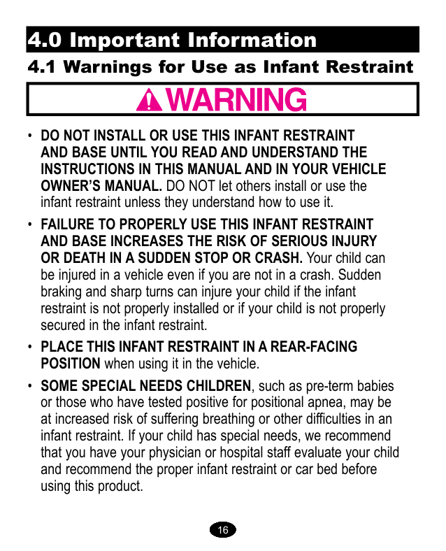 4.0 Información importante 4.1 Advertencias para uso como sistema de seguridad para niños