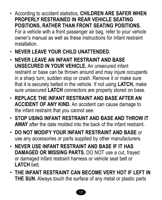 LOS ASIENTOS DELANTEROS. En el caso de un vehículo con una bolsa de aire para el pasajero delantero, consulte el manual del propietario de su vehículo así como estas instrucciones para la instalación del sistema de seguridad para niños.• Nunca Deje A Su Niño Solo.