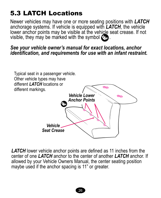 Vea el manual del propietario de su vehículo para informarse sobre las ubicaciones exactas, la identificación de los anclajes y los requisitos de uso con el sistema de seguridad para niños. Puntos de anclaje inferior del vehículo Pliegue del asiento del vehículo Un asiento típico de un vehículo de pasajeros. Otros tipos de vehículos disponen de otras ubicaciones del sistema LATCH o otros marcados. 26 26 26 26 26 26 26 Los puntos de anclaje LATCH inferiores del vehículo se definen como a 11 pulgadas desde el centro de un anclaje LATCH al centro de otro anclaje LATCH. Si lo permite el manual del propietario de su vehículo, la posición de sentado en el centro se puede usar si el espacio del anclaje es 11 pulgadas o más.