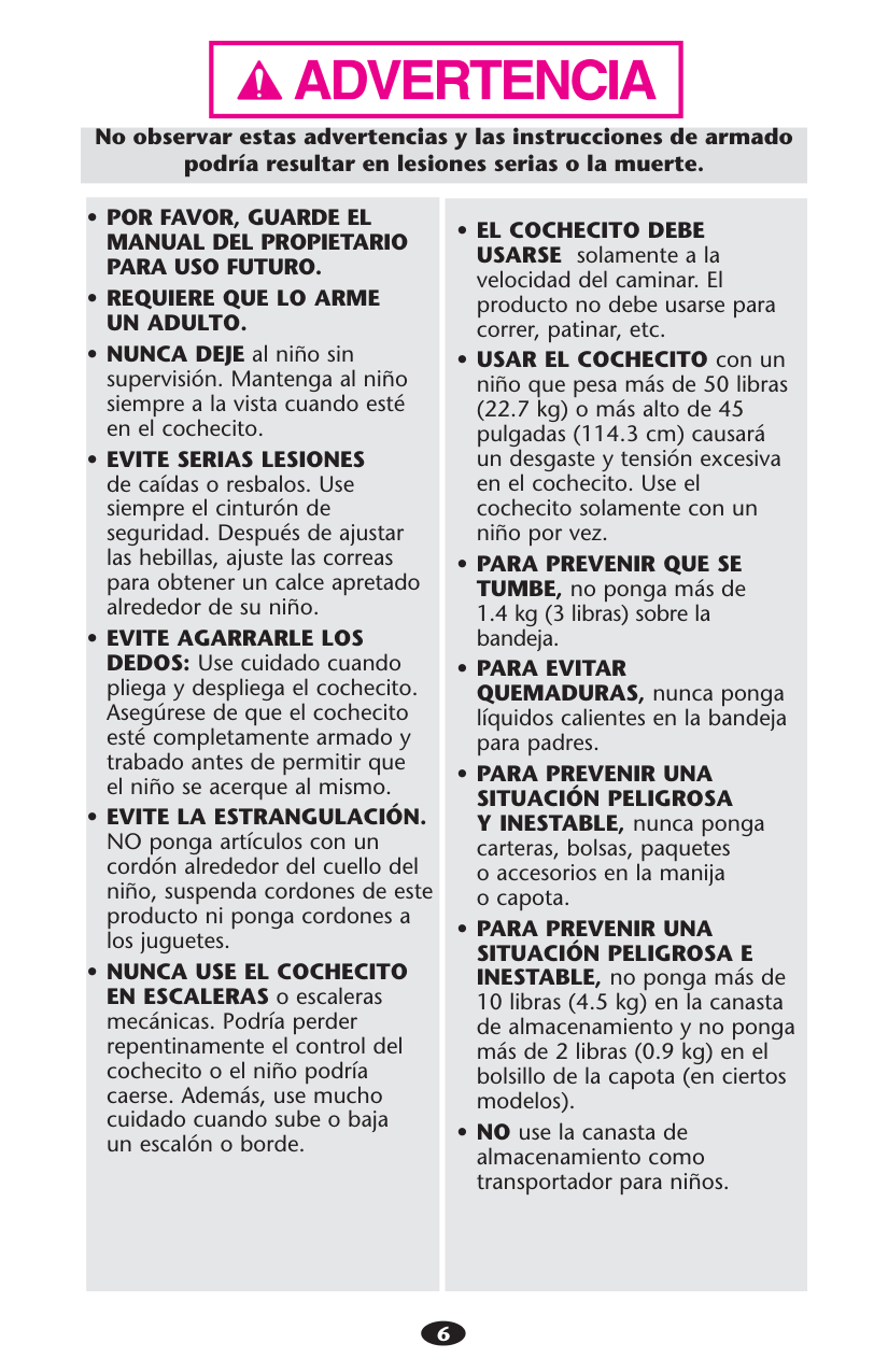 sNUNCA DEJE al niño sin supervisión. Mantenga al niño siempre a la vista cuando esté en el cochecito. sEVITE SERIAS LESIONES de caídas o resbalos. Use siempre el cinturón de seguridad. Después de ajustar las hebillas, ajuste las correas para obtener un calce apretado alrededor de su niño. sEVITE AGARRARLE LOS DEDOS: Use cuidado cuando pliega y despliega el cochecito. Asegúrese de que el cochecito esté completamente armado y trabado antes de permitir que el niño se acerque al mismo. sEVITE LA ESTRANGULACIÓN. NO ponga artículos con un cordón alrededor del cuello del niño, suspenda cordones de este producto ni ponga cordones a los juguetes. sNUNCA USE EL COCHECITO EN ESCALERAS o escaleras mecánicas. Podría perder repentinamente el control del cochecito o el niño podría caerse. Además, use mucho cuidado cuando sube o baja un escalón o borde. sEL COCHECITO DEBE USARSE solamente a la velocidad del caminar. El producto no debe usarse para correr, patinar, etc. sUSAR EL COCHECITO con un niño que pesa más de 50 libras (22.7 kg) o más alto de 45 pulgadas (114.3 cm) causará un desgaste y tensión excesiva en el cochecito. Use el cochecito solamente con un niño por vez. sPARA PREVENIR QUE SE TUMBE, no ponga más de 1.4 kg (3 libras) sobre la bandeja. sPARA EVITAR QUEMADURAS, nunca ponga líquidos calientes en la bandeja para padres. sPARA PREVENIR UNASituación Peligrosa