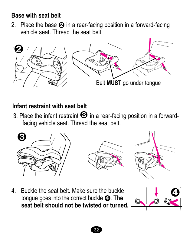 Para crear una instalación bien ajustada, apriete hacia abajo con fuerza con su rodilla o mano en el medio del sistema de seguridad para niños Î o base y tire y apriete el cinturón de seguridad del vehículo.