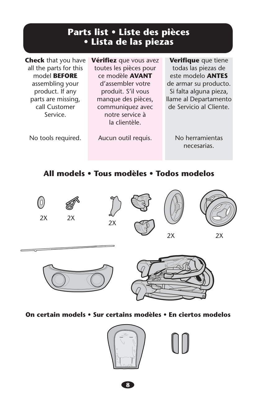 en este sistema de viaje. (No debe usarse con AUTOBABY (Europa solamente) y asientos de automóvil para bebé ASSURA.) El uso inadecuado de este cochecito con asientos para automóvil de otros fabricantes podría resultar en lesiones serias o la muerte. sLEA EL MANUAL incluido con su transportador Graco antes de usarlo con su cochecito. sASEGURE SIEMPRE a su niño con el arnés del transportador cuando usa el transportador en el cochecito. Si su niño ya está en el transportador, verifique que esté asegurado con el arnés.8 0ARTSLISTs,ISTEDESPIÒCESs,ISTADELASPIEZAS Check that you have all the parts for this model BEFORE assembling your product. If any parts are missing, call Customer Service. No tools required. 6ÏRIlEZque vous avez toutes les pièces pour ce modèle AVANT d’assembler votre produit. S’il vous manque des pièces, communiquez avec notre service à la clientèle. Aucun outil requis. Verifique que tiene todas las piezas de este modelo ANTES de armar su producto. Si falta alguna pieza, llame al Departamento de Servicio al Cliente. No herramientas necesarias. !LLMODELSs4OUSMODÒLESs4ODOSMODELOS /NCERTAINMODELSs3URCERTAINSMODÒLESs%NCIERTOSMODELOS