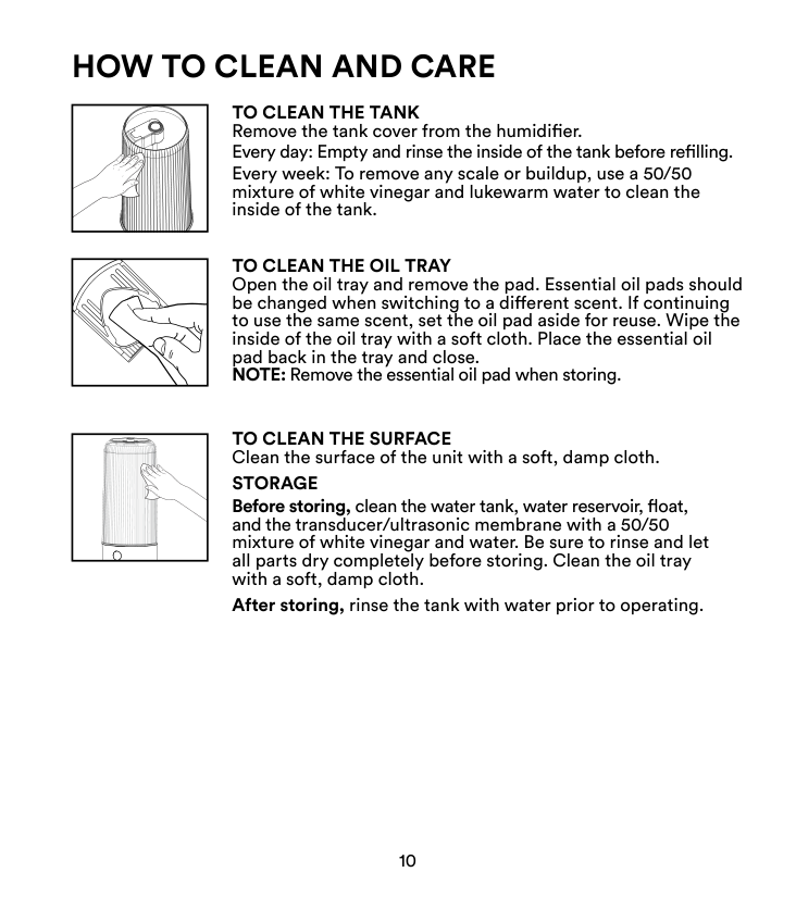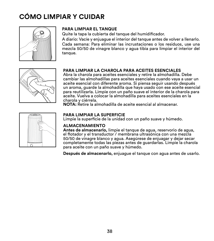 Antes de almacenarlo, limpie el tanque de agua, reservorio de agua, el flotador y el transductor / membrana ultrasónica con una mezcla 50/50 de vinagre blanco y agua. Asegúrese de enjuagar y dejar secar completamente todas las piezas antes de guardarlas. Limpie la charola para aceite con un paño suave y húmedo. Después de almacenarlo, enjuague el tanque con agua antes de usarlo.Cómo Limpiar Y Cuidar