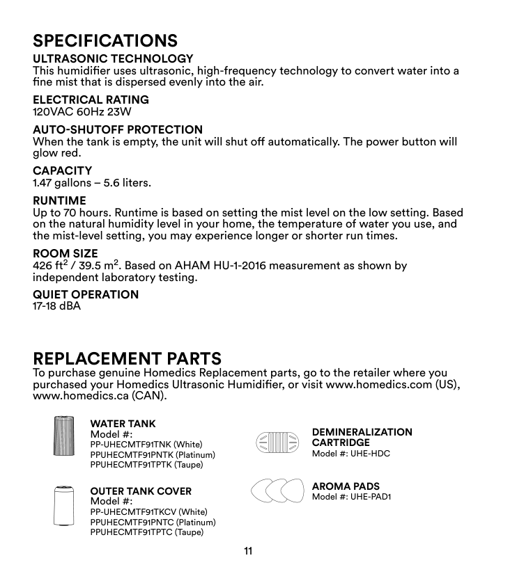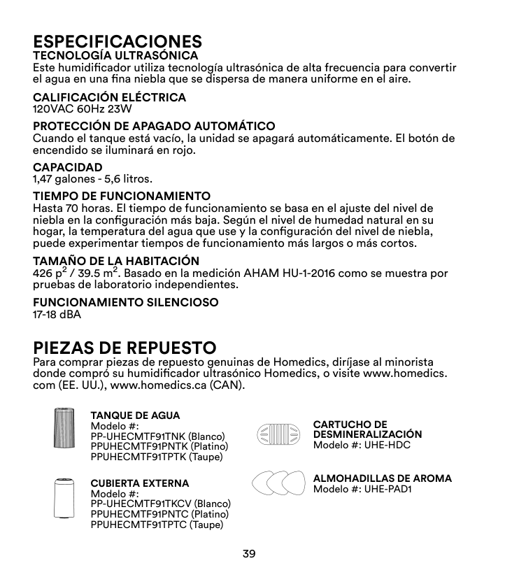 Para comprar piezas de repuesto genuinas de Homedics, diríjase al minorista donde compró su humidificador ultrasónico Homedics, o visite www.homedics. com (EE. UU.), www.homedics.ca (CAN).Tanque De Agua