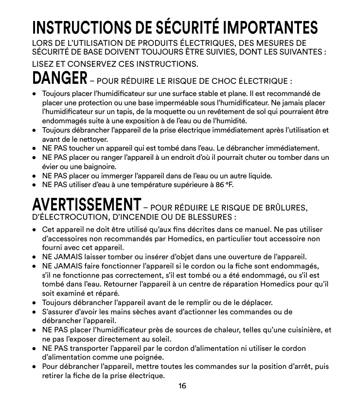 Coordonnées aux États-Unis Entreprise : Homedics, LLC. Adresse : 3000 N Pontiac Trail, Commerce Township, MI 48390 De 8 h 30 à 19 h EST, du lundi au vendredi, 1-800-466-3342 Homedics n’est pas responsable des interférences radio ou télévision causées par des modifications non autorisées apportées à cet équipement. De telles modifications peuvent annuler l’autorisation de l’utilisateur de faire fonctionner l’équipement. Cet équipement a été testé et s’est avéré conforme aux limites pour un dispositif numérique de classe B, conformément à la Partie 18 des règles de la FCC. Ces limites sont conçues pour offrir une protection raisonnable contre les interférences nuisibles dans une installation résidentielle. Cet équipement génère, utilise et peut émettre des ondes radio, et s’il n’est pas installé et utilisé conformément aux instructions, il peut causer des interférences nuisibles aux communications radio. Cependant, il n’y a aucune garantie que des interférences ne se produiront pas dans une installation particulière. Si cet équipement cause des interférences nuisibles à la réception radio ou télévision, ce qui peut être déterminé en éteignant et en rallumant l’équipement, l’utilisateur est encouragé à essayer de corriger les interférences par une ou plusieurs des mesures suivantes :
