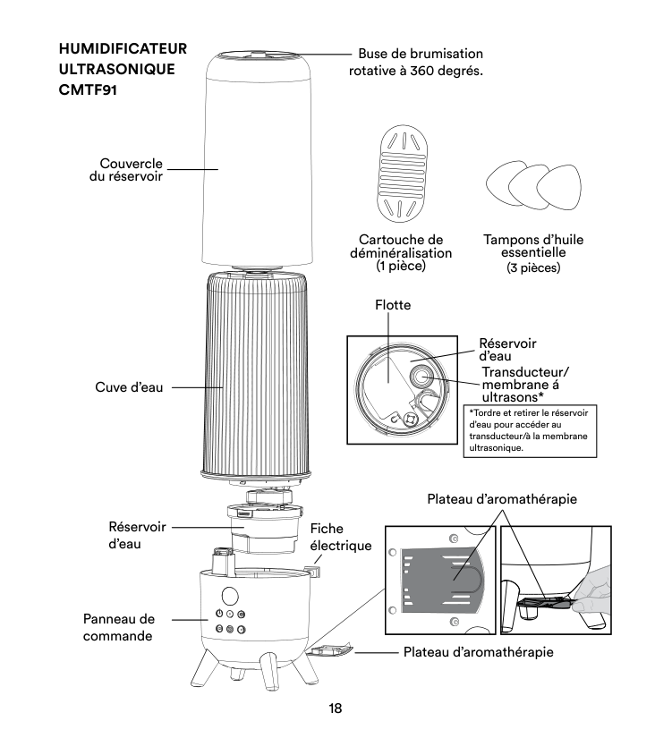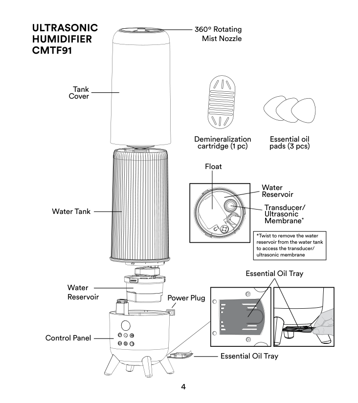 4 Essential Oil Tray 360º Rotating Mist Nozzle Power Plug Essential Oil Tray Tank Cover Water Tank Control Panel Water Reservoir Transducer/ Ultrasonic Membrane* Water Reservoir Float *Twist to remove the water reservoir from the water tank to access the transducer/ ultrasonic membrane