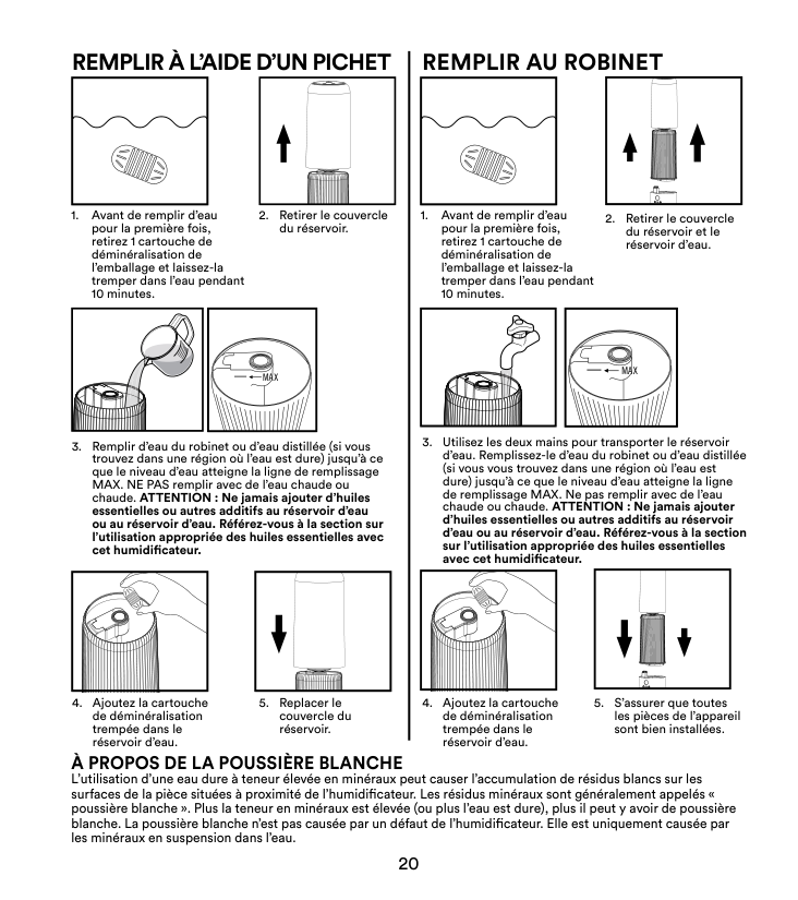 The Homedics demineralization cartridge will help reduce the potential for white dust, a deposit of minerals left behind from using hard water in your humidifier. The cartridge should be replaced every 30–40 fillings. The cartridge may need to be replaced more often if you are using very hard water.6