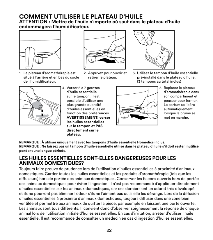 CAUTION: Putting oil anywhere but the oil tray will damage the humidifier. NOTE: For use with the included Homedics essential oil pads only. NOTE: Do not leave a used essential oil pad in the oil tray if it will be out of use for a long period of time.Are Essential Oils Safe To Use Around Pets?