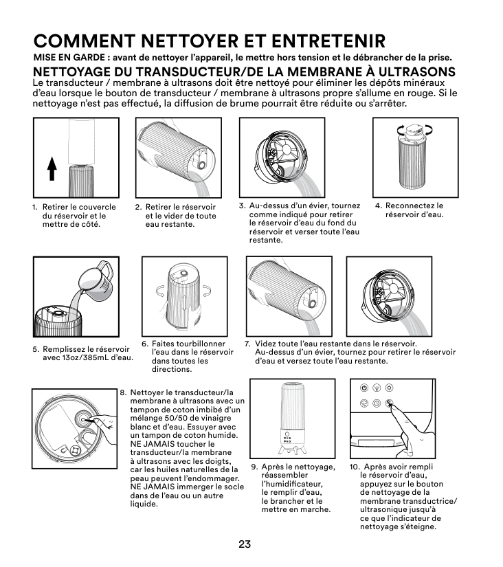 Unplug the unit first, then remove the tank cover and water tank. Pour out remaining water, fill with 13oz/385mL of water and swish it around, then pour it out. Clean the transducer/ultrasonic membrane with a 50/50 mix of white vinegar and water on a cotton swab, then wipe with a damp cotton swab. Never touch the membrane with your fingers or submerge the base in water.