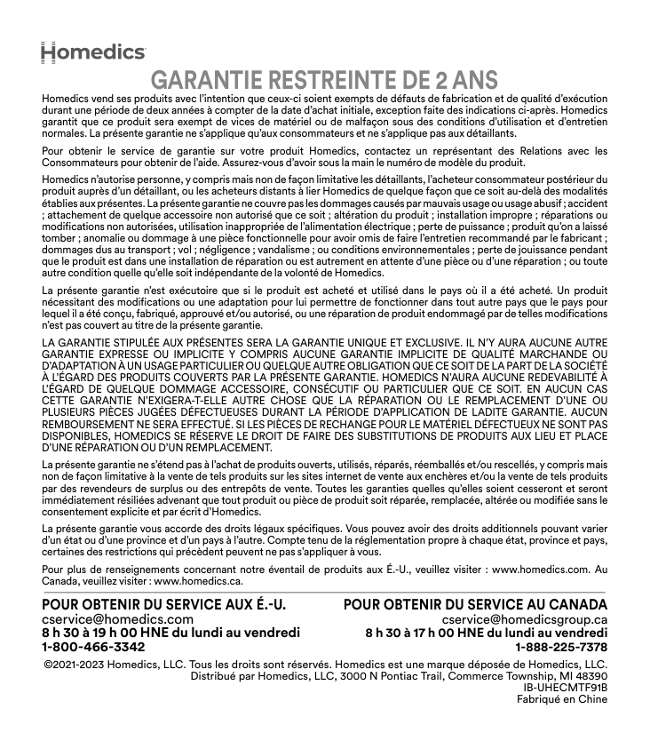 ©2021-2023 Homedics, LLC. Tous les droits sont réservés. Homedics est une marque déposée de Homedics, LLC. Distribué par Homedics, LLC, 3000 N Pontiac Trail, Commerce Township, MI 48390Ib-Uhecmtf91B