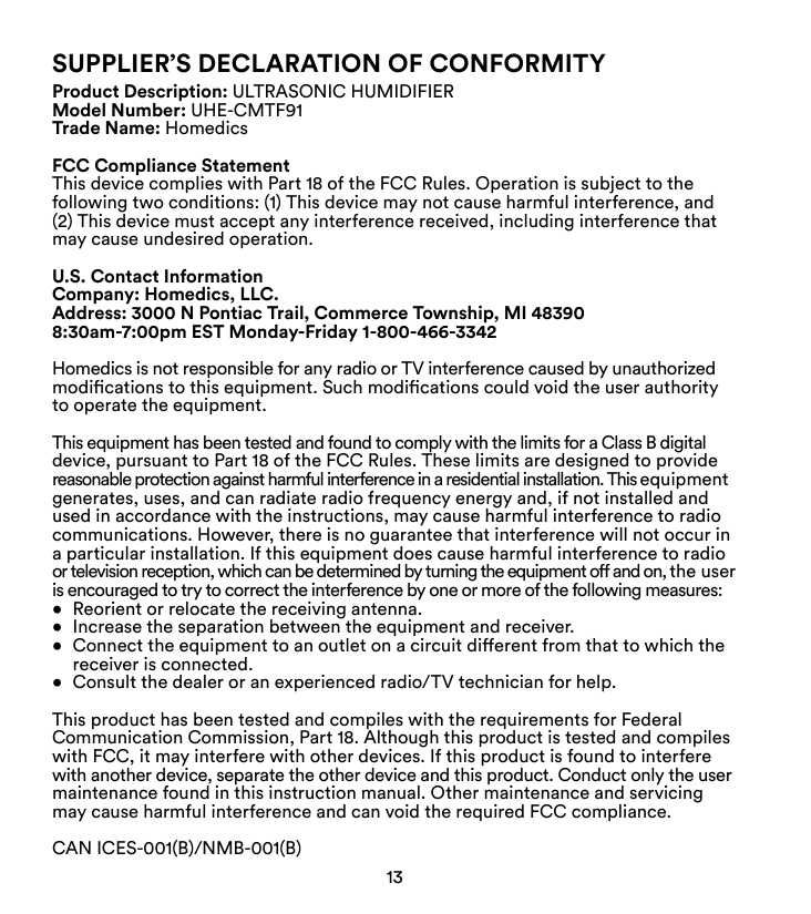 Descripción del producto: HUMIDIFICADOR ULTRASÓNICO Número de modelo: UHE-CMTF91 Nombre comercial: HomedicsDeclaración de conformidad con la FCC Este dispositivo cumple con la Parte 18 de las Reglas de la FCC. La operación está sujeta a las siguientes dos condiciones: (1) Este dispositivo no puede causar interferencias perjudiciales, y (2) Este dispositivo debe aceptar cualquier interferencia recibida, incluyendo la interferencia que pueda causar una operación no deseada. Información de contacto en EE. UU. Compañía: Homedics, LLC. Dirección: 3000 N Pontiac Trail, Commerce Township, MI 48390 8:30 a.m. a 7:00 p.m. EST de lunes a viernes 1-800-466-3342 Homedics no es responsable de ninguna interferencia de radio o televisión causada por modificaciones no autorizadas en este equipo. Tales modificaciones pueden anular la autoridad del usuario para operar el equipo. Este equipo ha sido probado y se ha encontrado que cumple con los límites de un dispositivo digital Clase B, según la Parte 18 de las Reglas de la FCC. Estos límites están diseñados para proporcionar una protección razonable contra interferencias perjudiciales en una instalación residencial. Este equipo genera, utiliza y puede radiar energía de radiofrecuencia y, si no se instala y utiliza de acuerdo con las instrucciones, puede causar interferencias perjudiciales en las comunicaciones de radio. Sin embargo, no se garantiza que no ocurran interferencias en una instalación particular. Si este equipo causa interferencias perjudiciales en la recepción de radio o televisión, lo cual puede determinarse apagando y encendiendo el equipo, se recomienda que el usuario intente corregir las interferencias mediante una o más de las siguientes medidas: