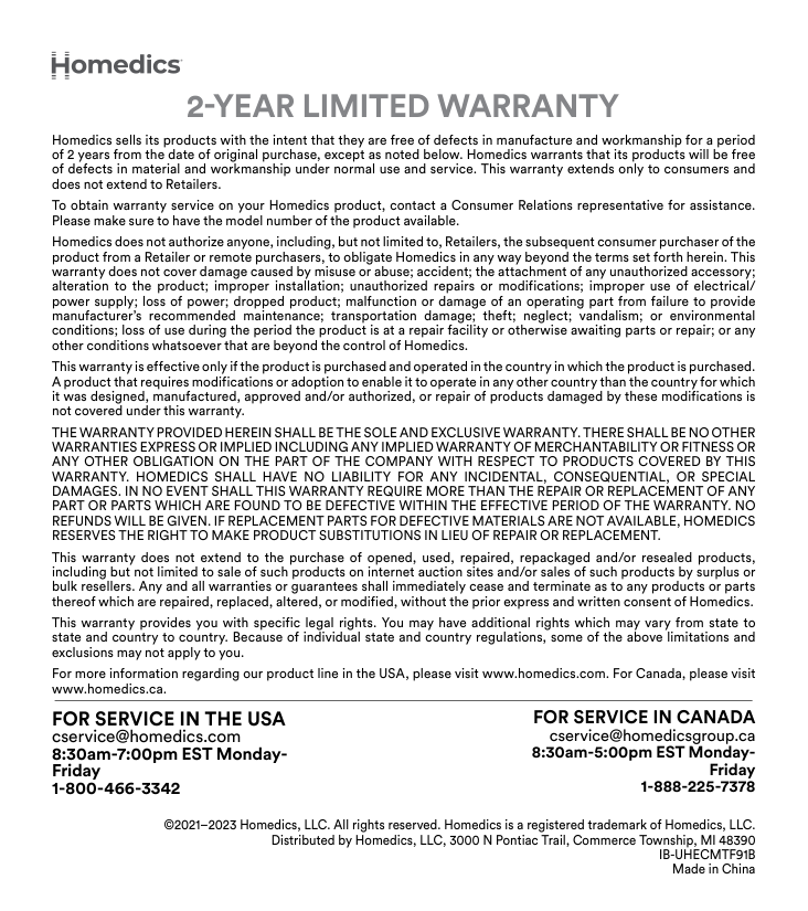 ©2021-2023 Homedics, LLC. Tous les droits sont réservés. Homedics est une marque déposée de Homedics, LLC. Distribué par Homedics, LLC, 3000 N Pontiac Trail, Commerce Township, MI 48390Ib-Uhecmtf91B