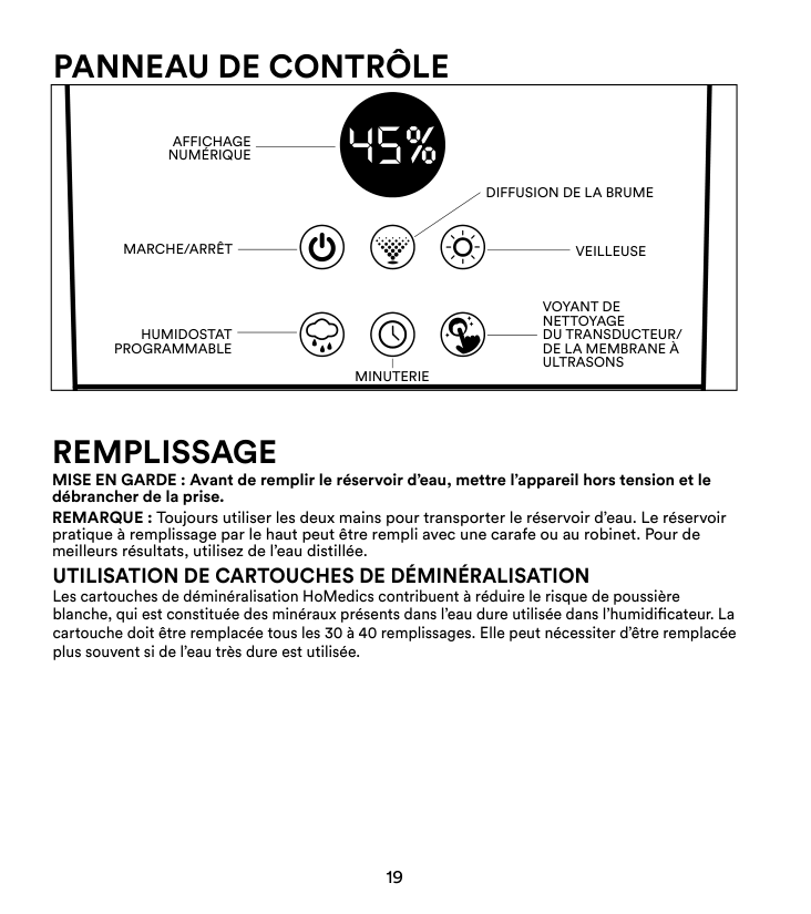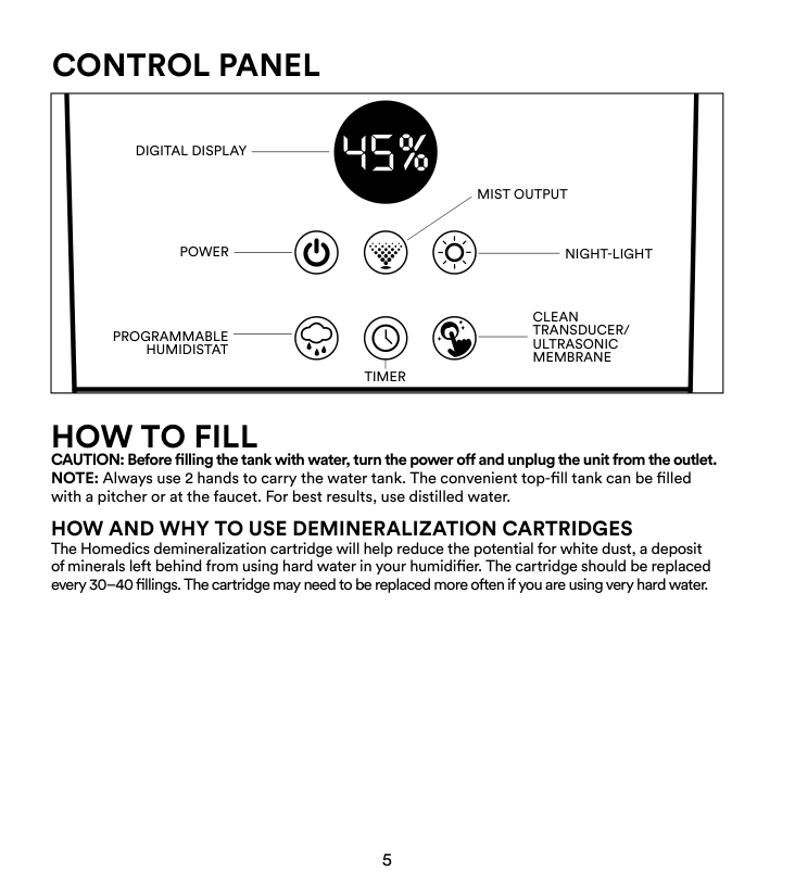 The Homedics demineralization cartridge will help reduce the potential for white dust, a deposit of minerals left behind from using hard water in your humidifier. The cartridge should be replaced every 30–40 fillings. The cartridge may need to be replaced more often if you are using very hard water.6