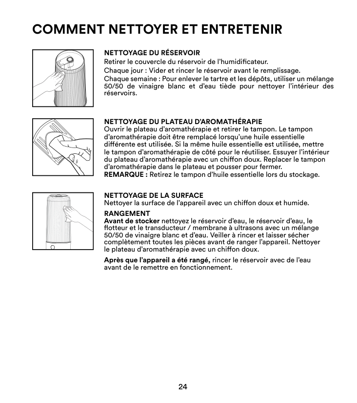 Antes de almacenarlo, limpie el tanque de agua, reservorio de agua, el flotador y el transductor / membrana ultrasónica con una mezcla 50/50 de vinagre blanco y agua. Asegúrese de enjuagar y dejar secar completamente todas las piezas antes de guardarlas. Limpie la charola para aceite con un paño suave y húmedo. Después de almacenarlo, enjuague el tanque con agua antes de usarlo.Cómo Limpiar Y Cuidar