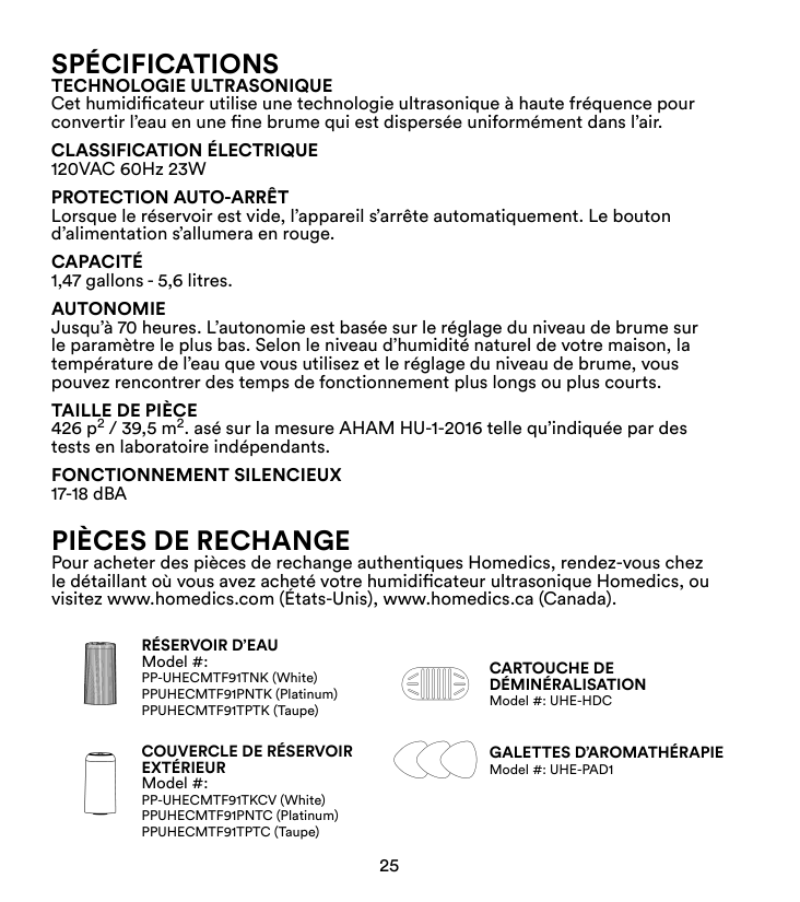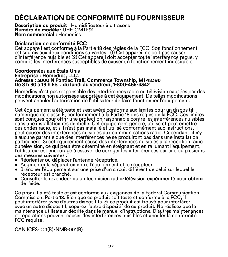 Description du produit : Humidificateur à ultrasons Numéro de modèle : UHE-CMTF91 Nom commercial : HomedicsDéclaration de conformité FCC Cet appareil est conforme à la Partie 18 des règles de la FCC. Son fonctionnement est soumis aux deux conditions suivantes : (1) Cet appareil ne doit pas causer d’interférence nuisible et (2) Cet appareil doit accepter toute interférence reçue, y compris les interférences susceptibles de causer un fonctionnement indésirable.