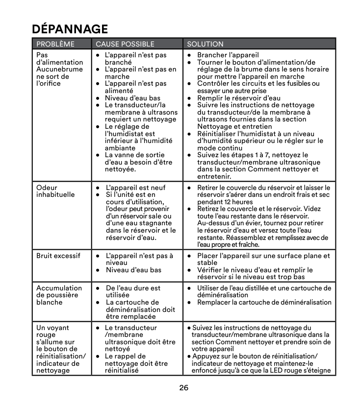 Pas d’alimentation Aucunebrume ne sort de l’orificeDépannage