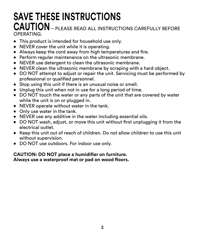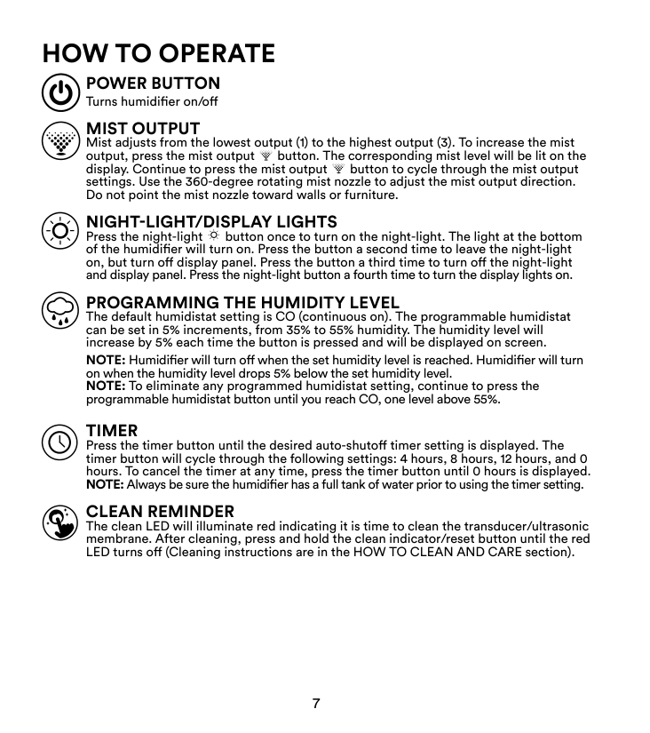 Mist adjusts from the lowest output (1) to the highest output (3). To increase the mist output, press the mist output button. The corresponding mist level will be lit on the display. Continue to press the mist output button to cycle through the mist output settings. Use the 360-degree rotating mist nozzle to adjust the mist output direction. Do not point the mist nozzle toward walls or furniture.Night-Light/Display Lights
