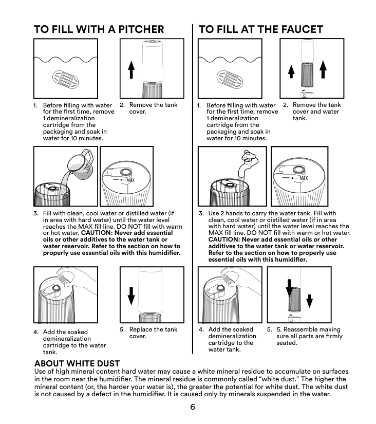 CAUTION: Before filling the tank with water, turn the power off and unplug the unit from the outlet. NOTE: Always use 2 hands to carry the water tank. The convenient top-fill tank can be filled with a pitcher or at the faucet. For best results, use distilled water.How And Why To Use Demineralization Cartridges
