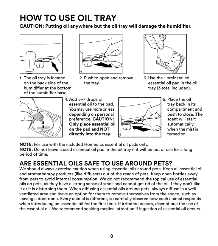 PRECAUCIÓN: Poner aceite en cualquier lugar que no sea la bandeja de aceite dañará el humidificador. NOTA: Para usar solo con las almohadillas de aceite esencial Homedics incluidas. NOTA: No deje una almohadilla de aceite esencial usada en la bandeja de aceite si estará fuera de uso durante mucho tiempo.¿Son Peligrosos Los Aceites Esenciales Para Los Animales Domésticos?