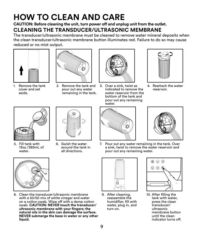 El transductor / membrana ultrasónica debe limpiarse para eliminar los depósitos minerales de agua cuando el botón limpio del transductor / membrana ultrasónica se ilumina en rojo. El no hacerlo puede reducir o bloquear la salida de niebla.38