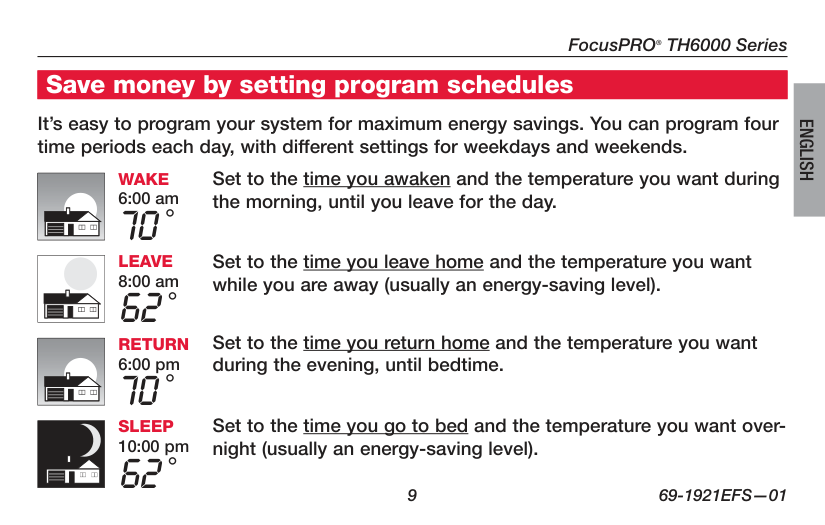 Wake (6:00 am) Leave (8:00 am) Return (6:00 pm) Sleep (10:00 pm) Cool (Mon-Fri) Heat (Mon-Fri) Heat (Sat-Sun) Cool (Sat-Sun) 70 ° 75 ° 70 ° 75 ° 62 ° 83 ° 62 ° [Or cancel period] 83 ° [Or cancel period] 70 ° 75 ° 70 ° [Or cancel period] 75 ° [Or cancel period] 62 ° 78 ° 62 ° 78 ° EnergyStar ® settings for maximum cost savings This thermostat is pre-set to use EnergyStar ® program settings. We recommend these settings, since they can reduce your heating/cooling expenses by as much as 33%. (See next page to adjust times and temperatures of each time period.)FocusPRO ® TH6000 Series