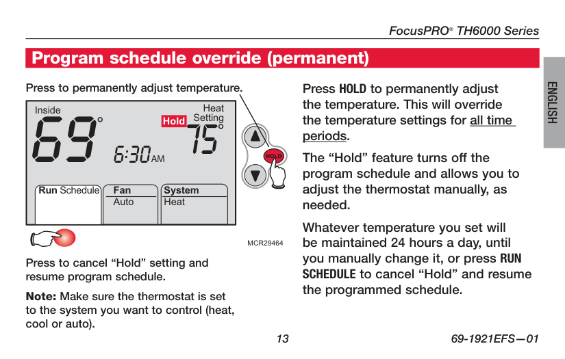 Press s or t to immediately adjust the temperature. This will temporarily override the temperature setting for the current time period. The new temperature will be maintained only until the next programmed time period begins (see page 10). For example, if you want to turn up the heat early in the morning, it will automatically be lowered later, when you leave for the day. To cancel the temporary setting at any time, press RUN SCHEDULE. Press to cancel temporary setting and resume program schedule. Note: Make sure the thermostat is set to the system you want to control (heat, cool or auto). Press to temporarily adjust temperature. Program schedule override (temporary)FocusPRO ® TH6000 Series