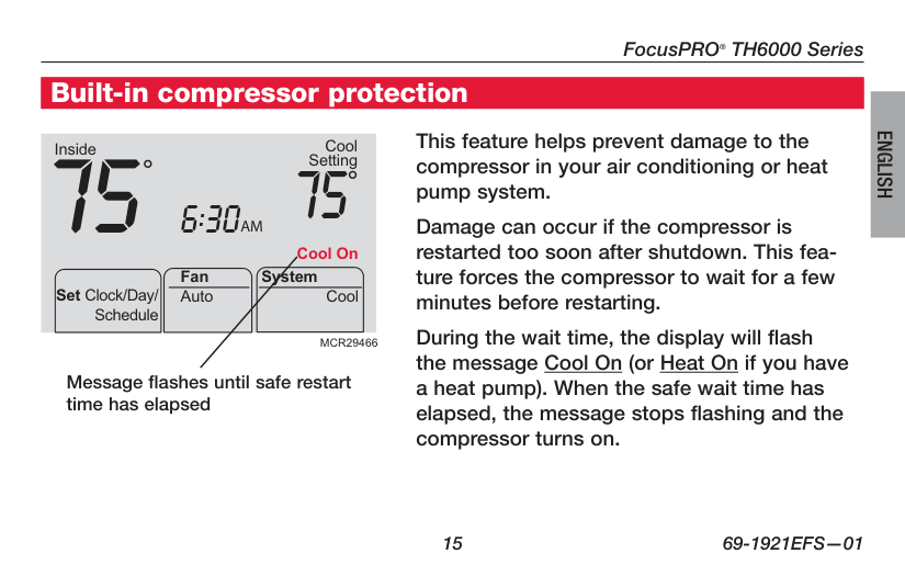This feature helps prevent damage to the compressor in your air conditioning or heat pump system. Damage can occur if the compressor is restarted too soon after shutdown. This fea ture forces the compressor to wait for a few minutes before restarting. During the wait time, the display will flash the message Cool On (or Heat On if you have a heat pump). When the safe wait time has elapsed, the message stops flashing and the compressor turns on. Message flashes until safe restart time has elapsed Built-in compressor protectionOperating Manual