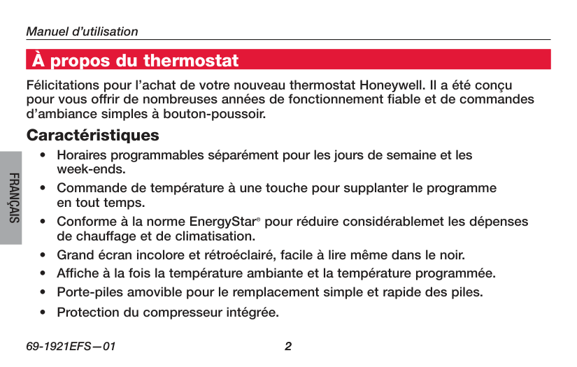About your new thermostat Congratulations on the purchase of your new Honeywell thermostat. It has been designed to give you many years of reliable service and easy-to-use, push-button climate control. FeaturesFocusPRO ® TH6000 Series