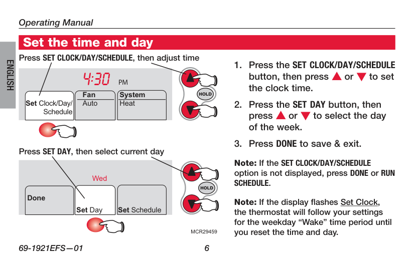 Press the FAN button to select Auto or On. In “Auto” mode (the most commonly used setting), the fan runs only when the heating or cooling system is on. If set to “On,” the fan runs continuously. Select the fan setting Set Clock/Day/ Schedule Auto Fan System Heat Set Clock/Day/ Schedule On Fan System HeatMcr29460