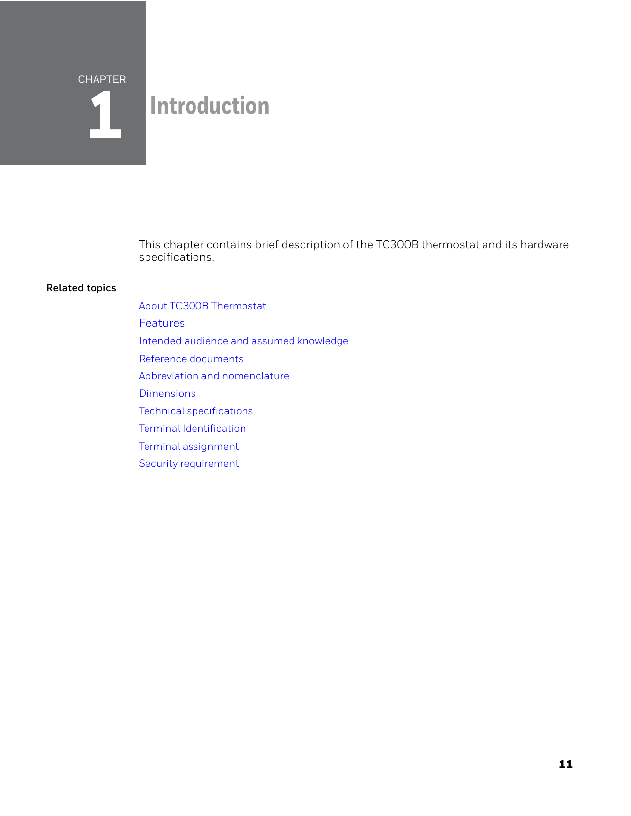 1 11 Introduction This chapter contains brief description of the TC300B thermostat and its hardware specifications. Related topics About TC300B Thermostat Features Intended audience and assumed knowledge Reference documents Abbreviation and nomenclature Dimensions Technical specifications Terminal Identification Terminal assignment Security requirement12 About TC300B Thermostat