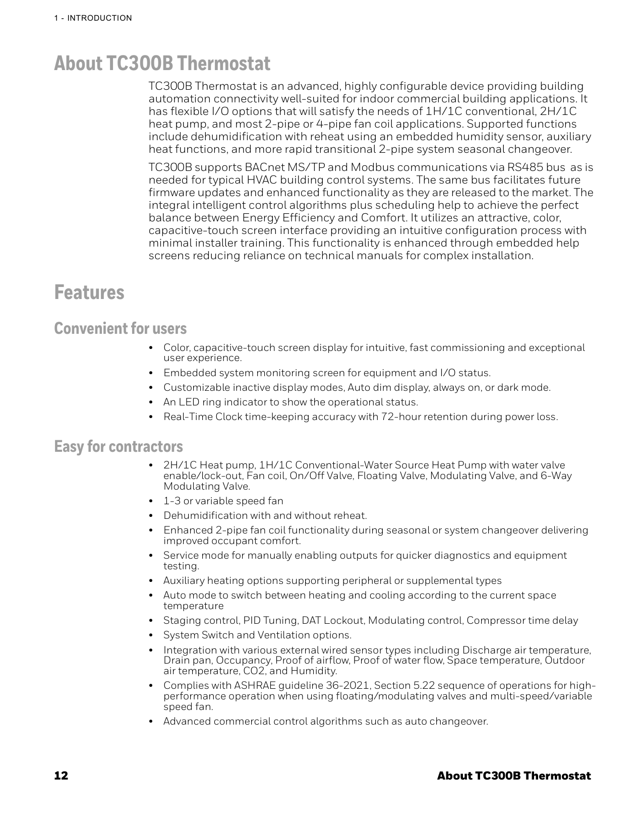 About TC300B Thermostat TC300B Thermostat is an advanced, highly configurable device providing building automation connectivity well-suited for indoor commercial building applications. It has flexible I/O options that will satisfy the needs of 1H/1C conventional, 2H/1C heat pump, and most 2-pipe or 4-pipe fan coil applications. Supported functions include dehumidification with reheat using an embedded humidity sensor, auxiliary heat functions, and more rapid transitional 2-pipe system seasonal changeover. TC300B supports BACnet MS/TP and Modbus communications via RS485 bus as is needed for typical HVAC building control systems. The same bus facilitates future firmware updates and enhanced functionality as they are released to the market. The integral intelligent control algorithms plus scheduling help to achieve the perfect balance between Energy Efficiency and Comfort. It utilizes an attractive, color, capacitive-touch screen interface providing an intuitive configuration process with minimal installer training. This functionality is enhanced through embedded help screens reducing reliance on technical manuals for complex installation. Features Convenient for users • Color, capacitive-touch screen display for intuitive, fast commissioning and exceptional user experience. • Embedded system monitoring screen for equipment and I/O status. • Customizable inactive display modes, Auto dim display, always on, or dark mode. • An LED ring indicator to show the operational status. • Real-Time Clock time-keeping accuracy with 72-hour retention during power loss. Easy for contractors • 2H/1C Heat pump, 1H/1C Conventional-Water Source Heat Pump with water valve enable/lock-out, Fan coil, On/Off Valve, Floating Valve, Modulating Valve, and 6-Way Modulating Valve. • 1-3 or variable speed fan • Dehumidification with and without reheat. • Enhanced 2-pipe fan coil functionality during seasonal or system changeover delivering improved occupant comfort. • Service mode for manually enabling outputs for quicker diagnostics and equipment testing. • Auxiliary heating options supporting peripheral or supplemental types • Auto mode to switch between heating and cooling according to the current space temperature • Staging control, PID Tuning, DAT Lockout, Modulating control, Compressor time delay • System Switch and Ventilation options. • Integration with various external wired sensor types including Discharge air temperature, Drain pan, Occupancy, Proof of airflow, Proof of water flow, Space temperature, Outdoor air temperature, CO2, and Humidity. • Complies with ASHRAE guideline 36-2021, Section 5.22 sequence of operations for high- performance operation when using floating/modulating valves and multi-speed/variable speed fan. • Advanced commercial control algorithms such as auto changeover.Intended audience and assumed knowledge 13