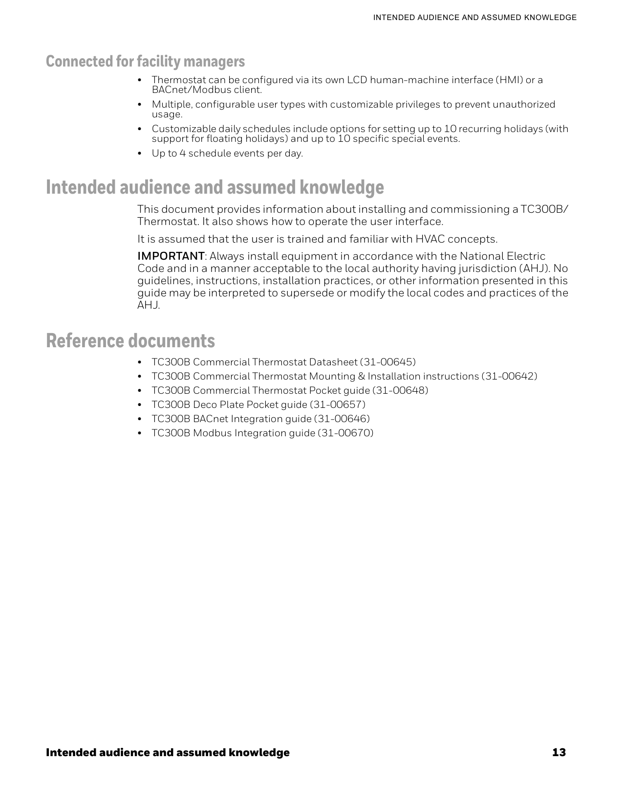 Connected for facility managers • Thermostat can be configured via its own LCD human-machine interface (HMI) or a BACnet/Modbus client. • Multiple, configurable user types with customizable privileges to prevent unauthorized usage. • Customizable daily schedules include options for setting up to 10 recurring holidays (with support for floating holidays) and up to 10 specific special events. • Up to 4 schedule events per day. Intended audience and assumed knowledge This document provides information about installing and commissioning a TC300B/ Thermostat. It also shows how to operate the user interface. It is assumed that the user is trained and familiar with HVAC concepts. IMPORTANT: Always install equipment in accordance with the National Electric Code and in a manner acceptable to the local authority having jurisdiction (AHJ). No guidelines, instructions, installation practices, or other information presented in this guide may be interpreted to supersede or modify the local codes and practices of theAhj.