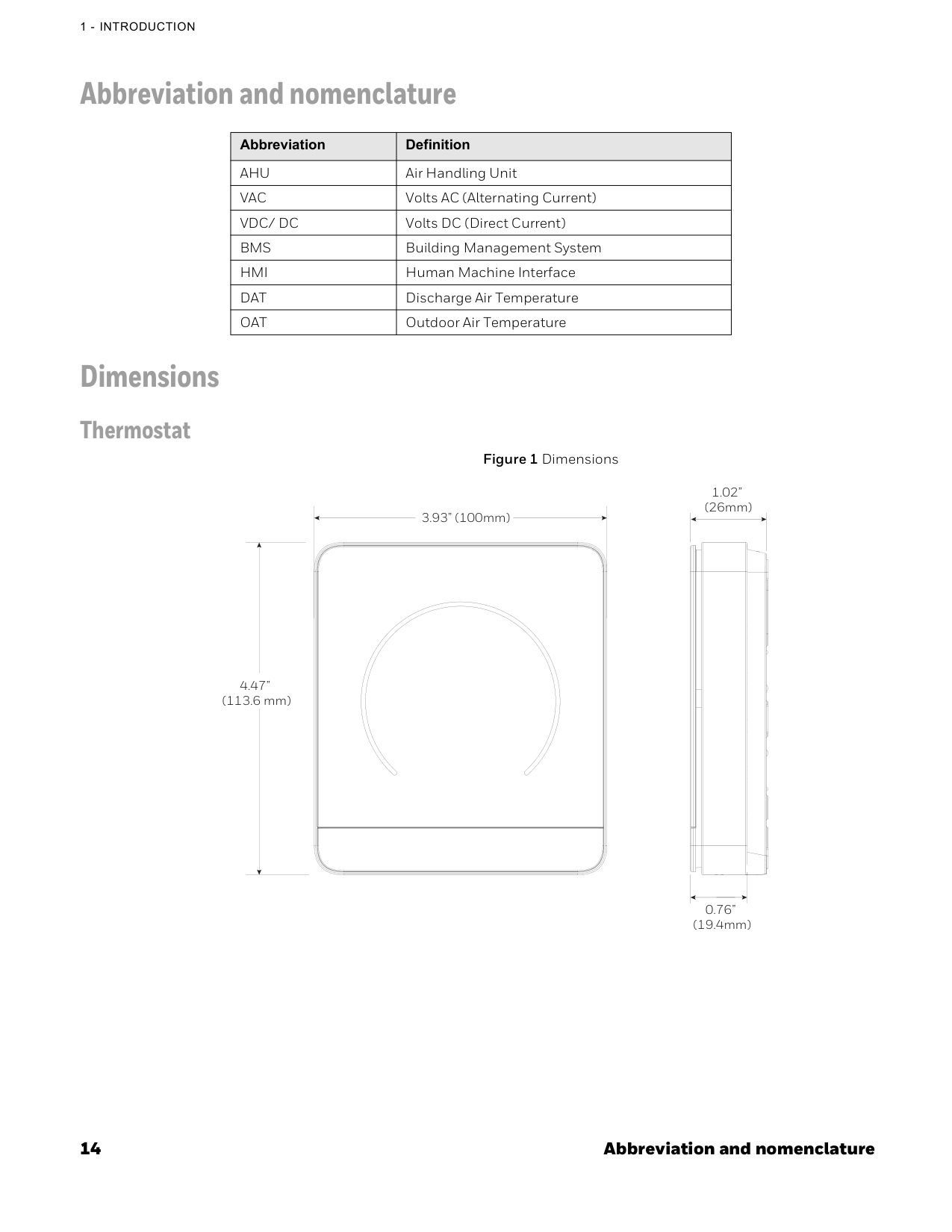 Abbreviation and nomenclature Dimensions Thermostat Figure 1 Dimensions Abbreviation DefinitionAhu