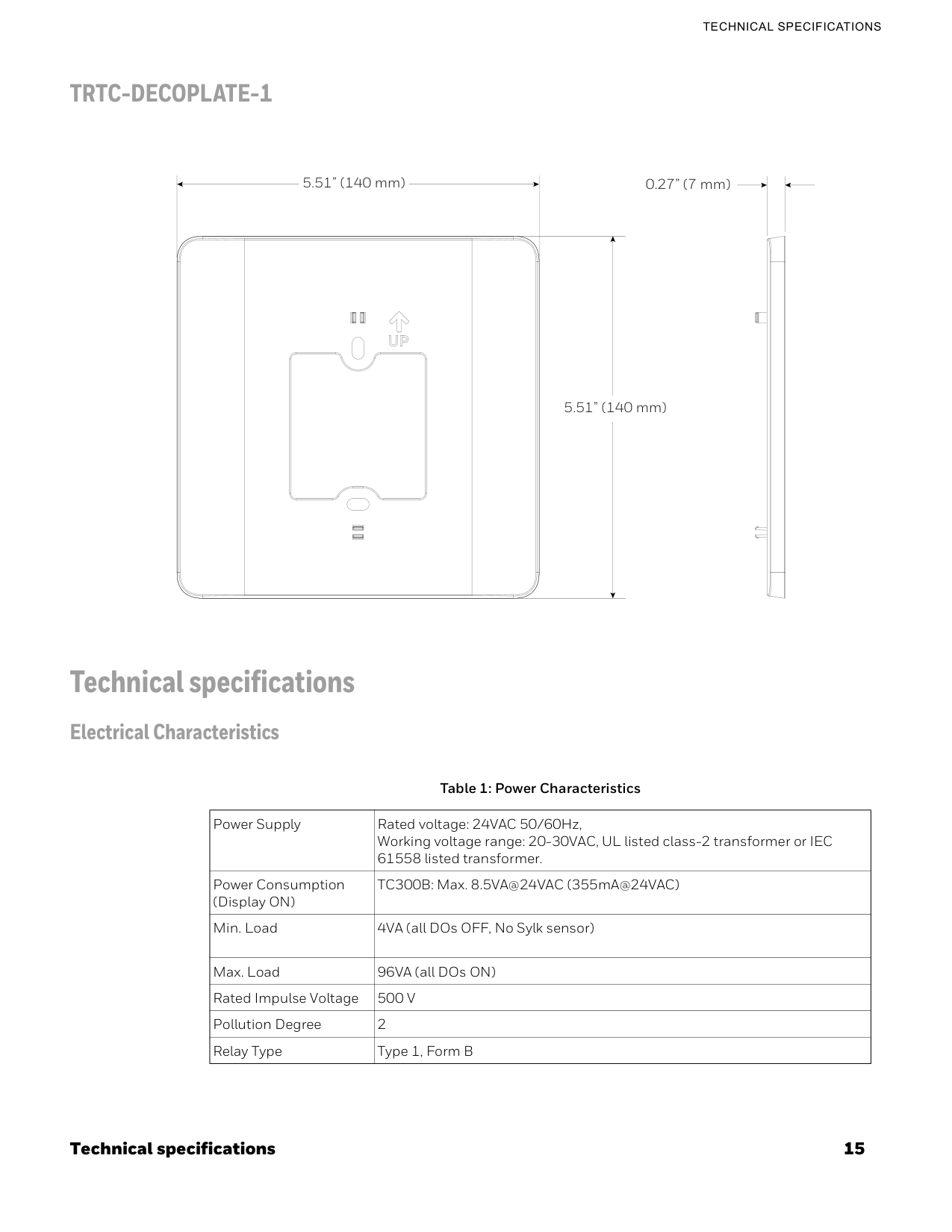 Technical specifications Electrical Characteristics 5.51” (140 mm) 5.51” (140 mm) 0.27” (7 mm) Table 1: Power Characteristics Power Supply Rated voltage: 24VAC 50/60Hz, Working voltage range: 20-30VAC, UL listed class-2 transformer or IEC 61558 listed transformer. Power Consumption (Display ON) TC300B: Max. 8.5VA@24VAC (355mA@24VAC) Min. Load 4VA (all DOs OFF, No Sylk sensor) Max. Load 96VA (all DOs ON) Rated Impulse Voltage500 V