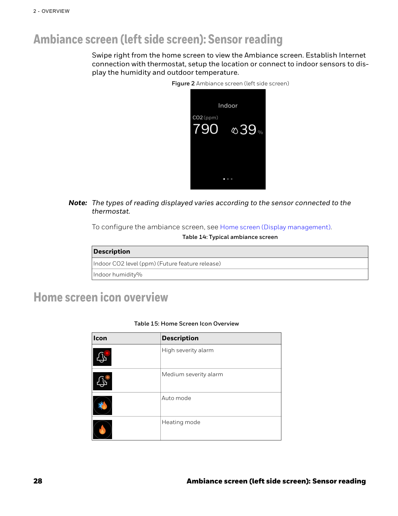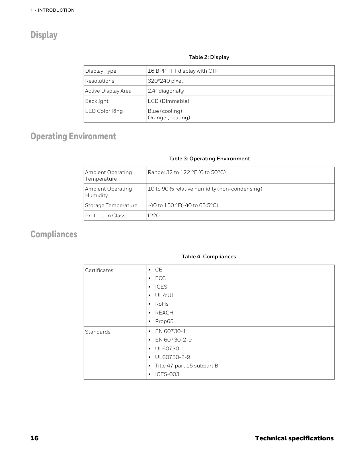 Display Operating Environment Compliances Table 2: Display Display Type 16 BPP TFT display with CTP Resolutions 320*240 pixel Active Display Area 2.4” diagonally Backlight LCD (Dimmable) LED Color Ring Blue (cooling) Orange (heating) Table 3: Operating Environment Ambient Operating Temperature Range: 32 to 122 °F (0 to 50°C) Ambient Operating Humidity 10 to 90% relative humidity (non-condensing) Storage Temperature -40 to 150 °F(-40 to 65.5°C) Protection ClassIp20