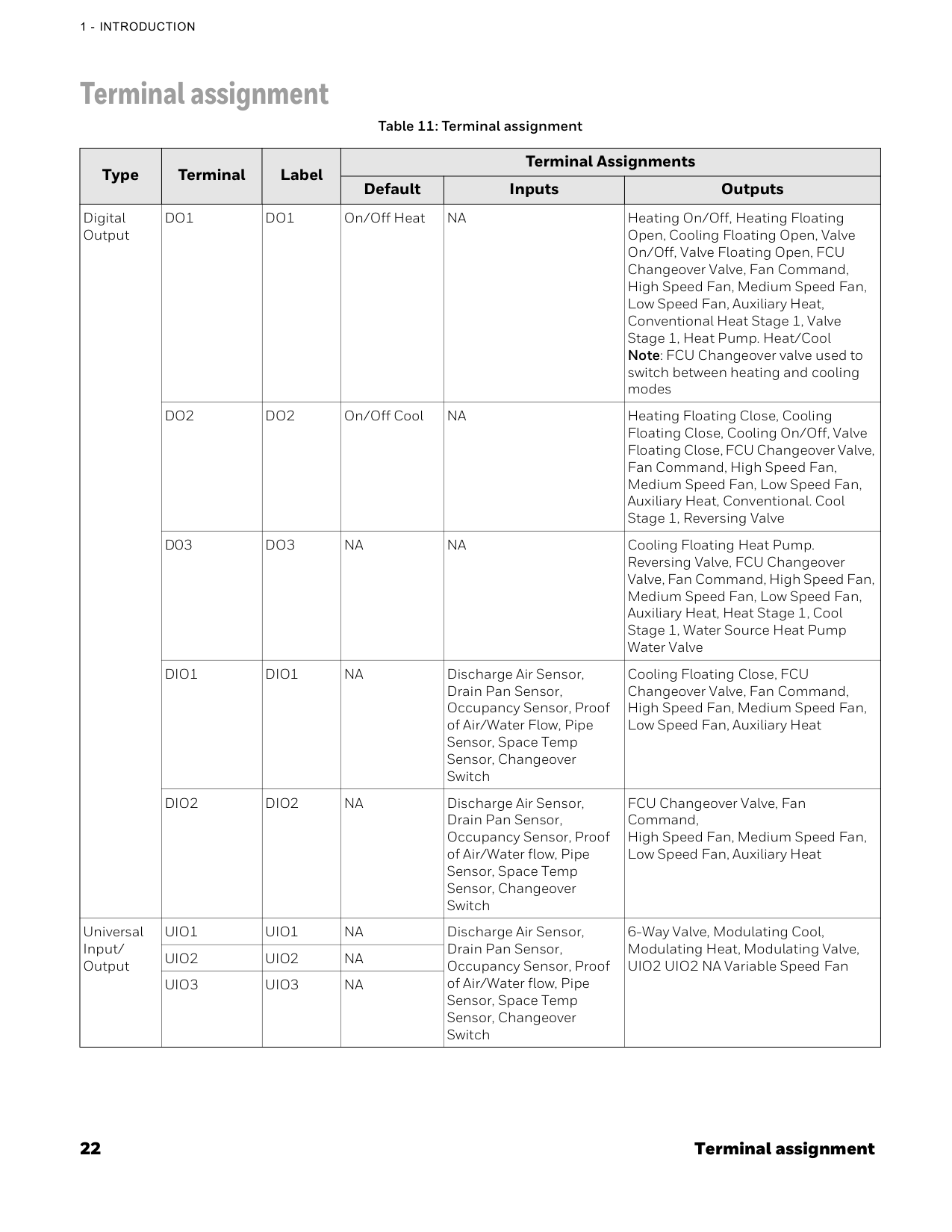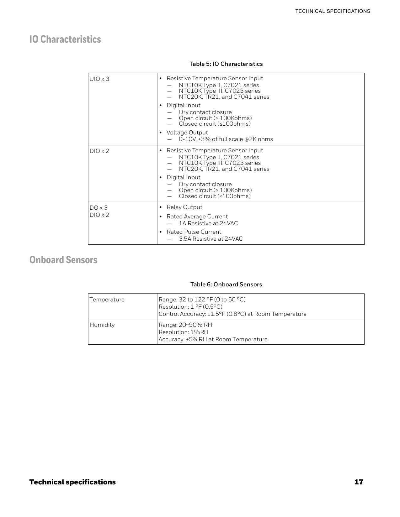 IO Characteristics Onboard Sensors Table 5: IO Characteristics UIO x 3 • Resistive Temperature Sensor Input — NTC10K Type II, C7021 series — NTC10K Type III, C7023 series — NTC20K, TR21, and C7041 series • Digital Input — Dry contact closure — Open circuit (≥ 100Kohms) — Closed circuit (≤100ohms) • Voltage Output — 0-10V, ±3% of full scale @2K ohms DIO x 2 • Resistive Temperature Sensor Input — NTC10K Type II, C7021 series — NTC10K Type III, C7023 series — NTC20K, TR21, and C7041 series • Digital Input — Dry contact closure — Open circuit (≥ 100Kohms) — Closed circuit (≤100ohms) DO x 3 DIO x 2 • Relay Output • Rated Average Current — 1A Resistive at 24VAC • Rated Pulse Current — 3.5A Resistive at 24VAC Table 6: Onboard Sensors Temperature Range: 32 to 122 °F (0 to 50 °C) Resolution: 1 °F (0.5°C) Control Accuracy: ±1.5°F (0.8°C) at Room Temperature Humidity Range: 20~90% RH Resolution: 1%RH Accuracy: ±5%RH at Room Temperature18 Technical specifications