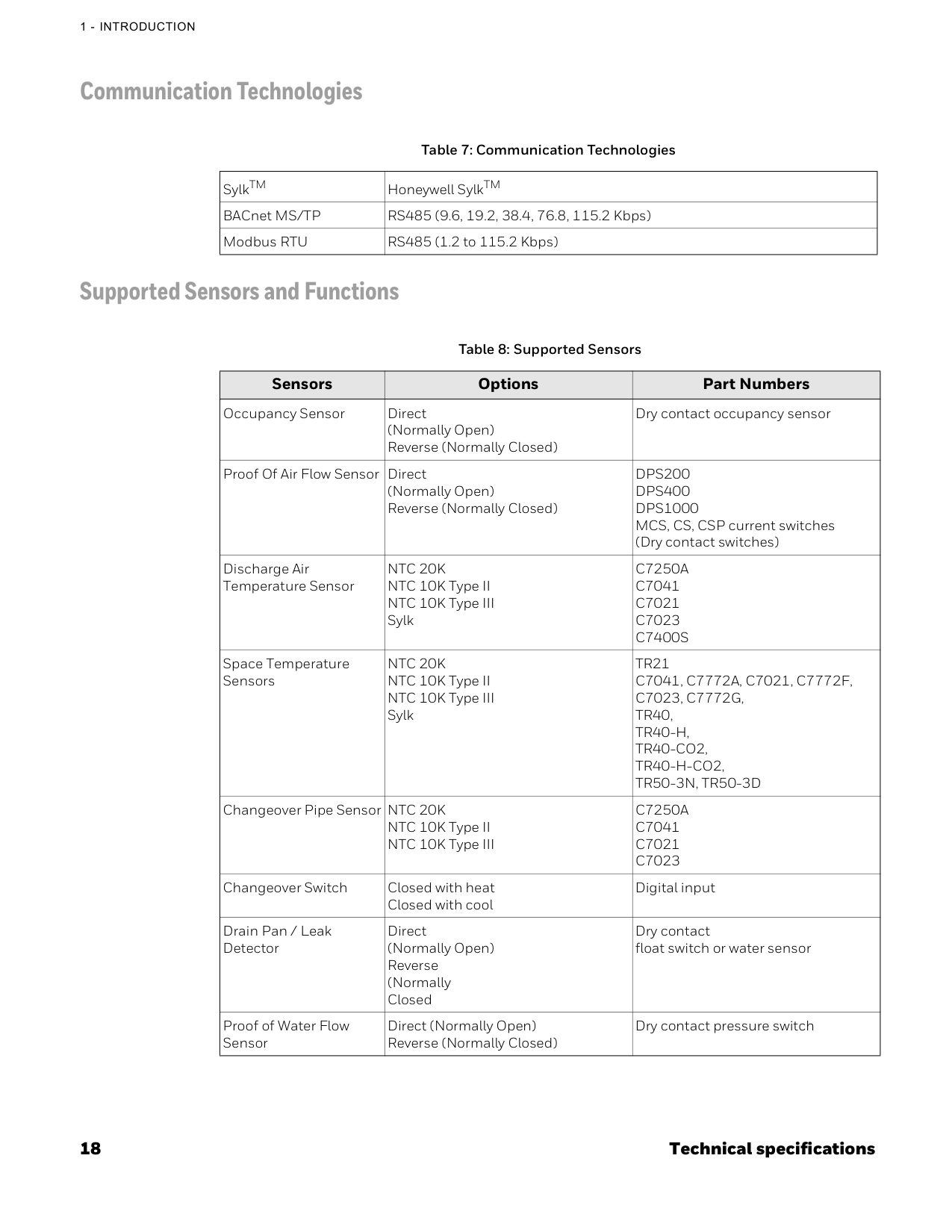 Communication Technologies Supported Sensors and Functions Table 7: Communication Technologies SylkTM Honeywell SylkTM BACnet MS/TP RS485 (9.6, 19.2, 38.4, 76.8, 115.2 Kbps) Modbus RTU RS485 (1.2 to 115.2 Kbps) Table 8: Supported Sensors Sensors Options Part Numbers Occupancy Sensor Direct (Normally Open) Reverse (Normally Closed) Dry contact occupancy sensor Proof Of Air Flow Sensor Direct (Normally Open) Reverse (Normally Closed)Dps200