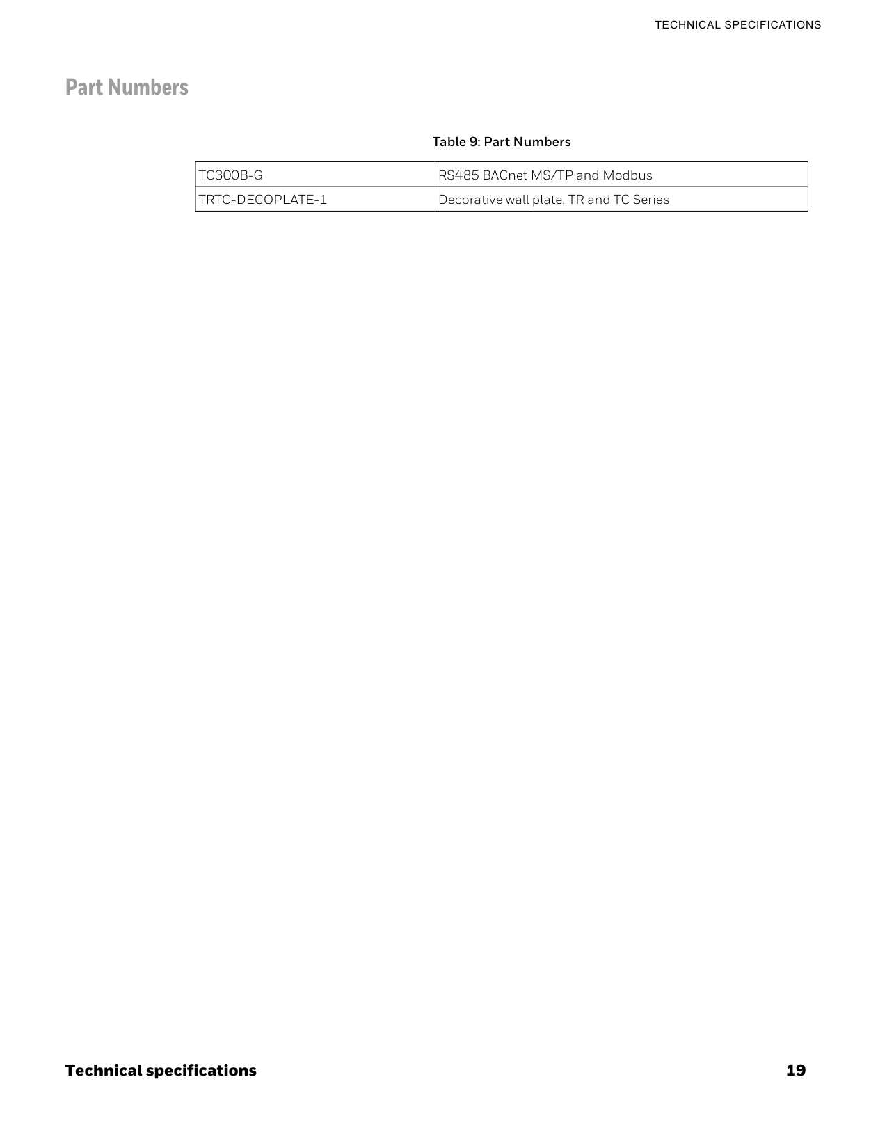 Reference documents • TC300B Commercial Thermostat Datasheet (31-00645) • TC300B Commercial Thermostat Mounting & Installation instructions (31-00642) • TC300B Commercial Thermostat Pocket guide (31-00648) • TC300B Deco Plate Pocket guide (31-00657) • TC300B BACnet Integration guide (31-00646) • TC300B Modbus Integration guide (31-00670)14 Abbreviation and nomenclature
