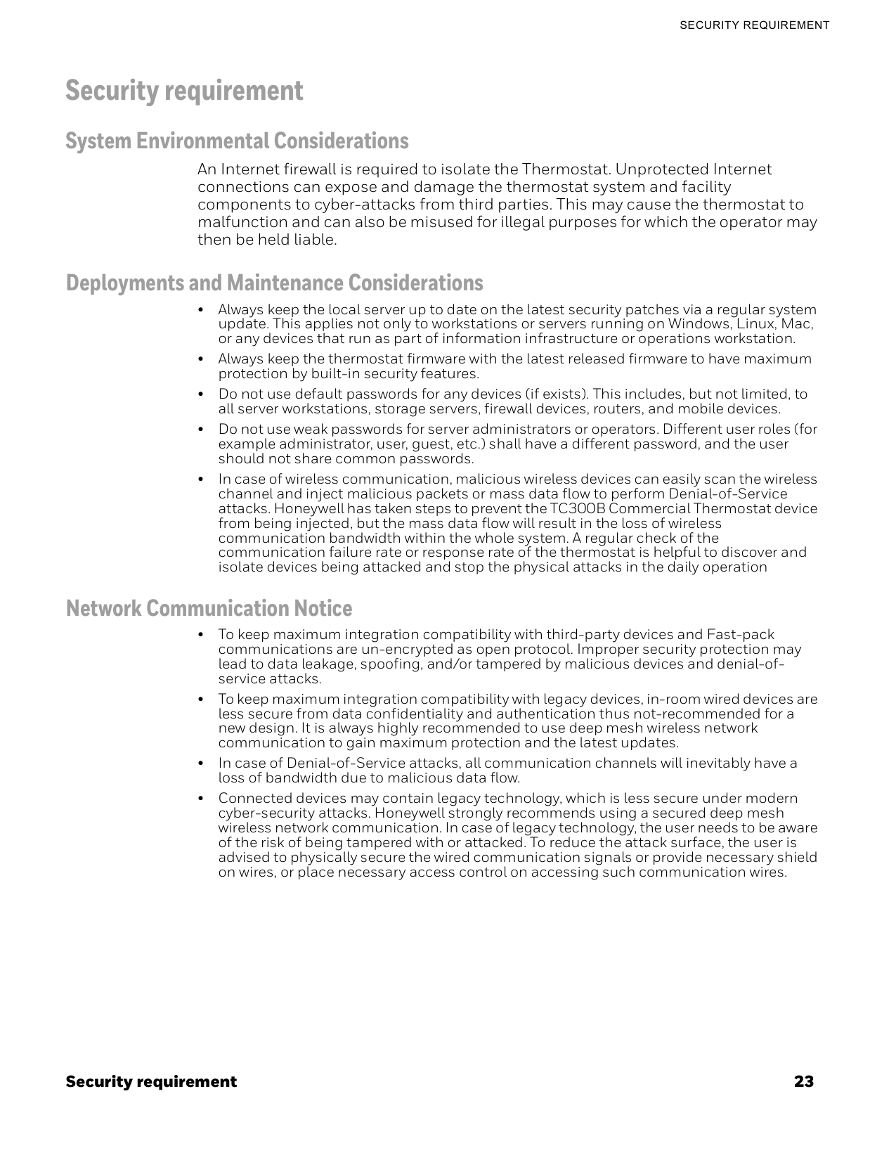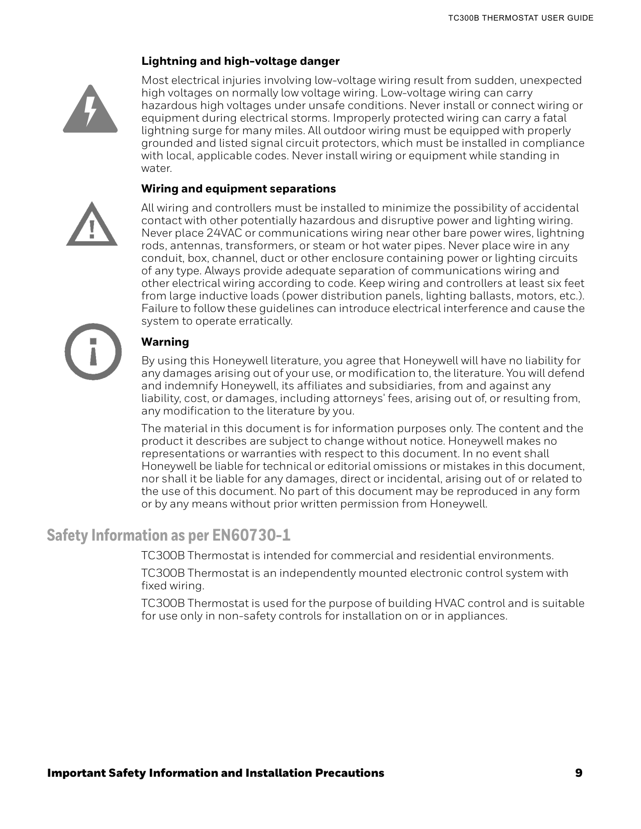 Lightning and high-voltage danger Most electrical injuries involving low-voltage wiring result from sudden, unexpected high voltages on normally low voltage wiring. Low-voltage wiring can carry hazardous high voltages under unsafe conditions. Never install or connect wiring or equipment during electrical storms. Improperly protected wiring can carry a fatal lightning surge for many miles. All outdoor wiring must be equipped with properly grounded and listed signal circuit protectors, which must be installed in compliance with local, applicable codes. Never install wiring or equipment while standing in water. Wiring and equipment separations All wiring and controllers must be installed to minimize the possibility of accidental contact with other potentially hazardous and disruptive power and lighting wiring. Never place 24VAC or communications wiring near other bare power wires, lightning rods, antennas, transformers, or steam or hot water pipes. Never place wire in any conduit, box, channel, duct or other enclosure containing power or lighting circuits of any type. Always provide adequate separation of communications wiring and other electrical wiring according to code. Keep wiring and controllers at least six feet from large inductive loads (power distribution panels, lighting ballasts, motors, etc.). Failure to follow these guidelines can introduce electrical interference and cause the system to operate erratically. Warning By using this Honeywell literature, you agree that Honeywell will have no liability for any damages arising out of your use, or modification to, the literature. You will defend and indemnify Honeywell, its affiliates and subsidiaries, from and against any liability, cost, or damages, including attorneys' fees, arising out of, or resulting from, any modification to the literature by you. The material in this document is for information purposes only. The content and the product it describes are subject to change without notice. Honeywell makes no representations or warranties with respect to this document. In no event shall Honeywell be liable for technical or editorial omissions or mistakes in this document, nor shall it be liable for any damages, direct or incidental, arising out of or related to the use of this document. No part of this document may be reproduced in any form or by any means without prior written permission from Honeywell. Safety Information as per EN60730-1 TC300B Thermostat is intended for commercial and residential environments. TC300B Thermostat is an independently mounted electronic control system with fixed wiring. TC300B Thermostat is used for the purpose of building HVAC control and is suitable for use only in non-safety controls for installation on or in appliances.Chapter